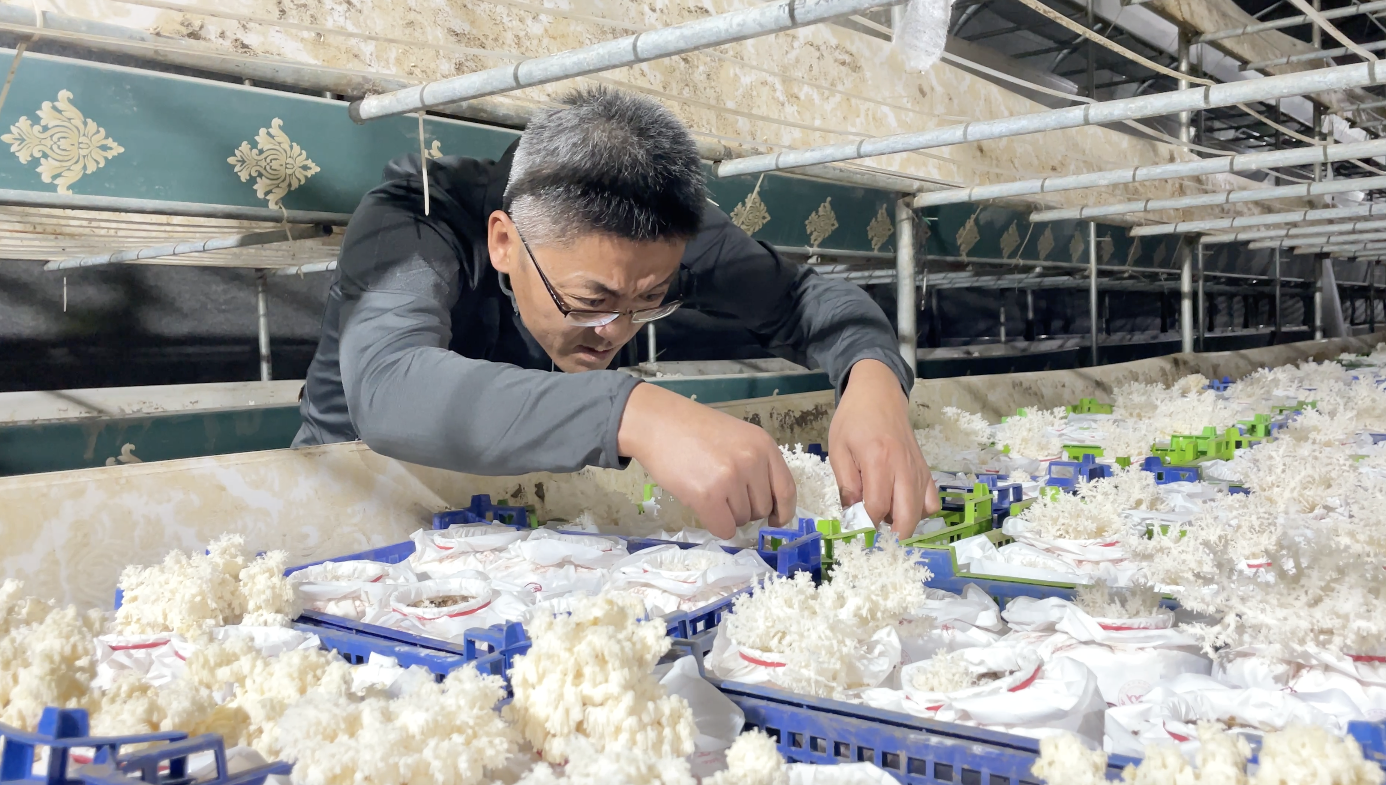王志刚查看珊瑚猴头菇的生长情况。