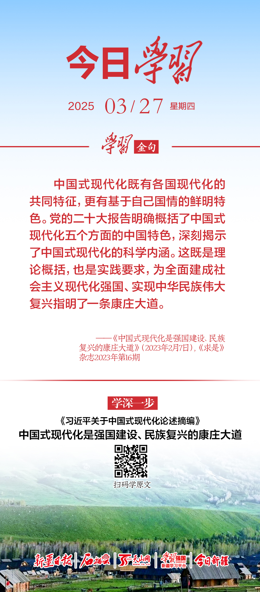中国式现代化既有各国现代化的共同特征,更有基于自己国情的鲜明特色。党的二十大报告明确概括了中国式现代化五个方面的中国特色,深刻揭示了中国式现代化的科学内涵。这既是理论概括,也是实践要求,为全面建成社会主义现代化强国、实现中华民族伟大复兴指明了一条康庄大道。