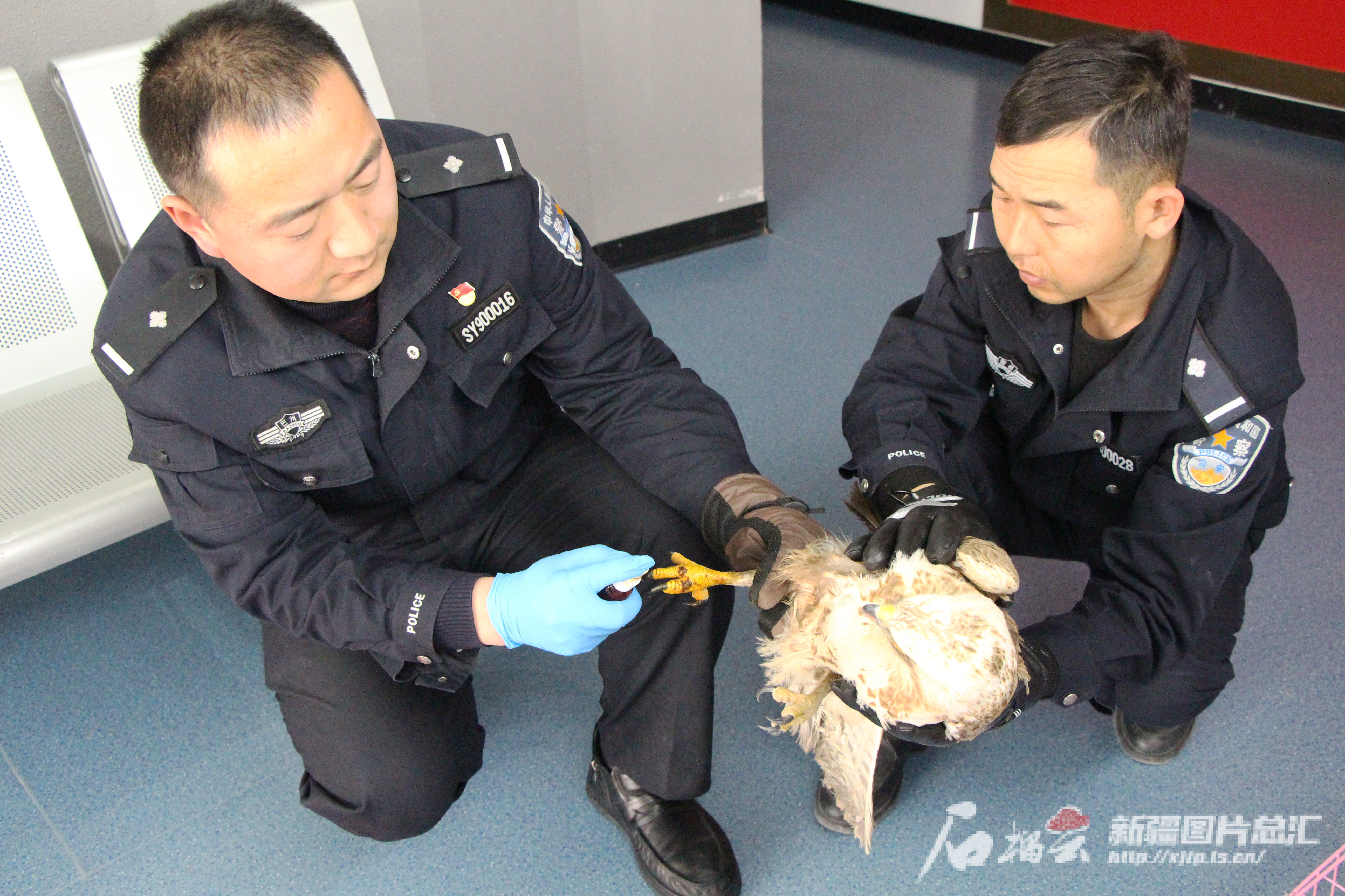 3月5日,博湖县公安局食品药品环境犯罪侦查大队民警在博斯腾湖边救助一只国家二级保护动物棕尾鵟。刘伸 摄