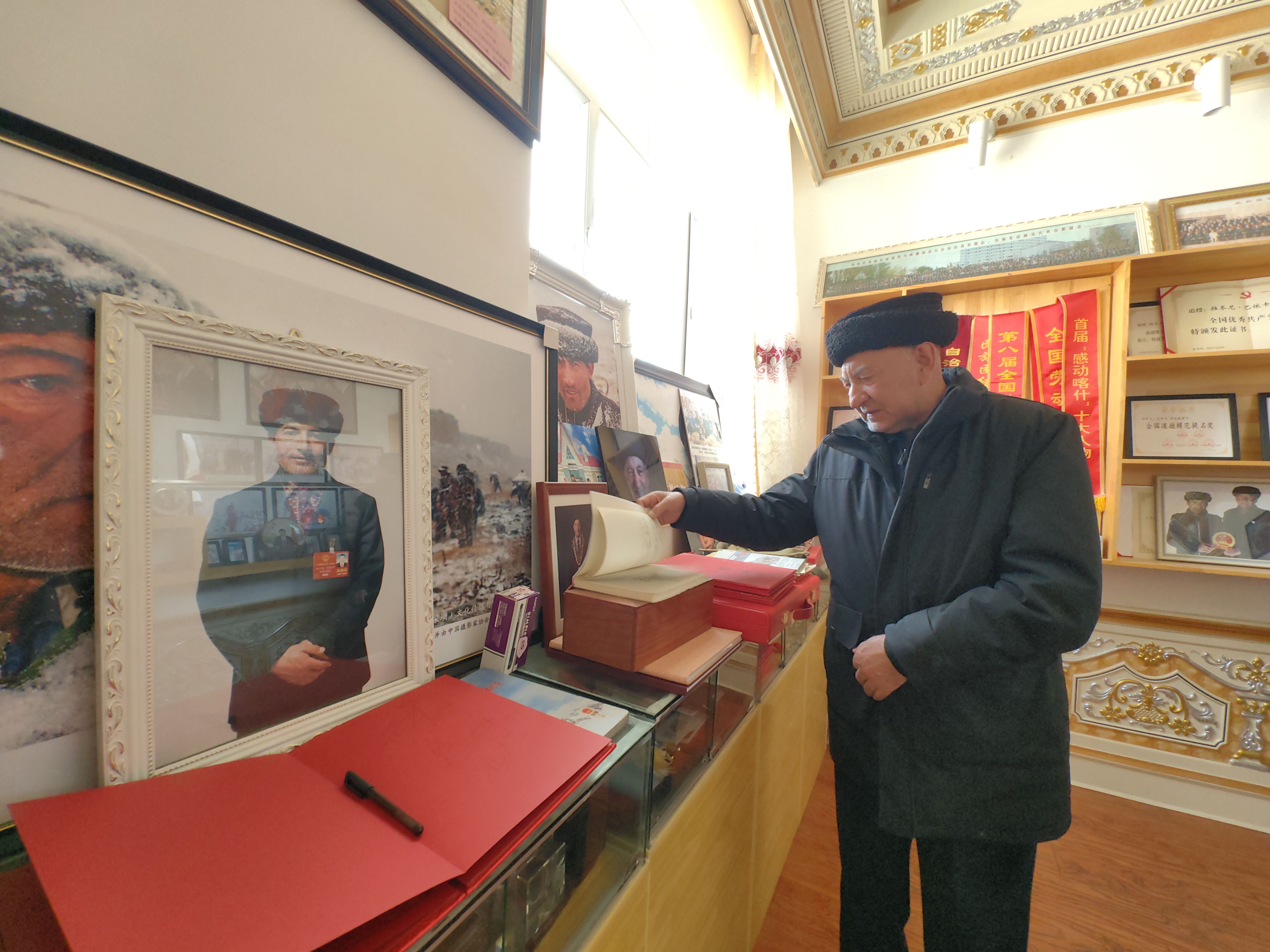 英雄瞬间:冰湖上的生命托举。纪念馆玻璃柜中,一张拉齐尼身着军装、佩戴“全国人大代表”证件的照片尤为醒目。2021年1月4日,这位护边员代表在喀什大学校园内,为救落水儿童纵身跃入冰湖,以生命完成最后的守护。寒冰之上,他奋力托举孩童的身影,化作帕米尔高原永恒的精神丰碑。