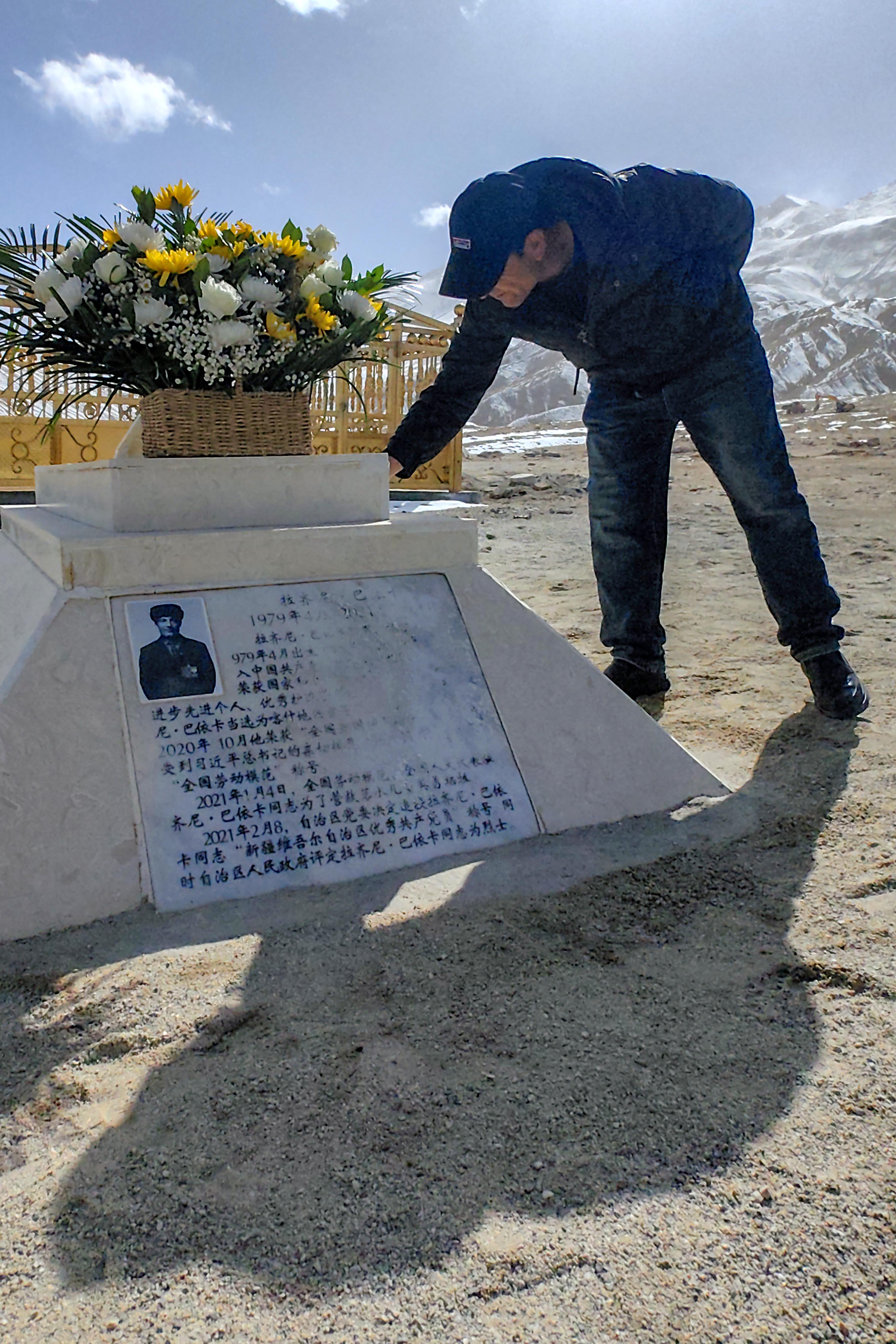 3月29日,一位当地群众在塔什库尔干塔吉克自治县提孜那甫乡提孜那甫村拉齐尼墓碑旁摆放鲜花。