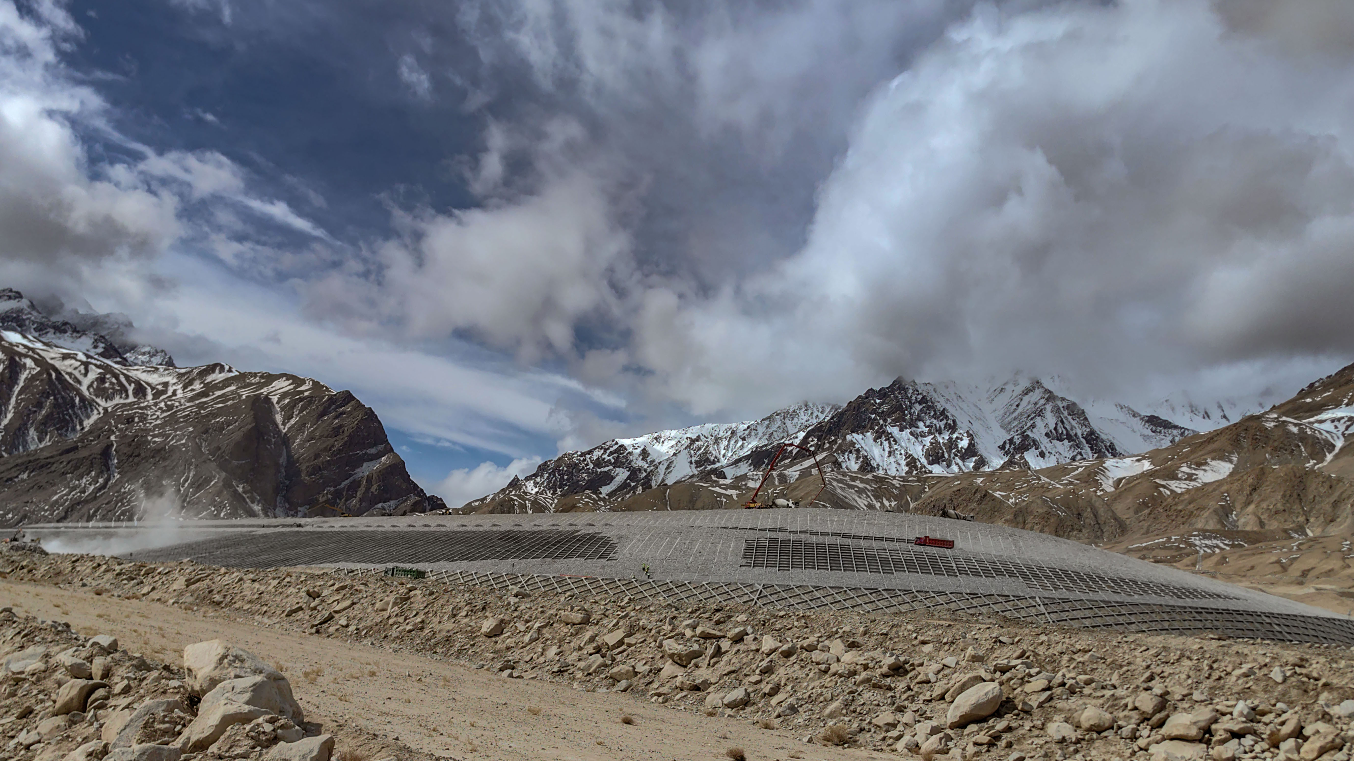 3月29日,在塔什库尔干塔吉克自治县提孜那甫乡拍摄的阿然保泰水库。这个水库是拉齐尼生前建议修建的民生工程。如今,总工程量已超过七成,预计9月底水库建成并实现下闸蓄水。