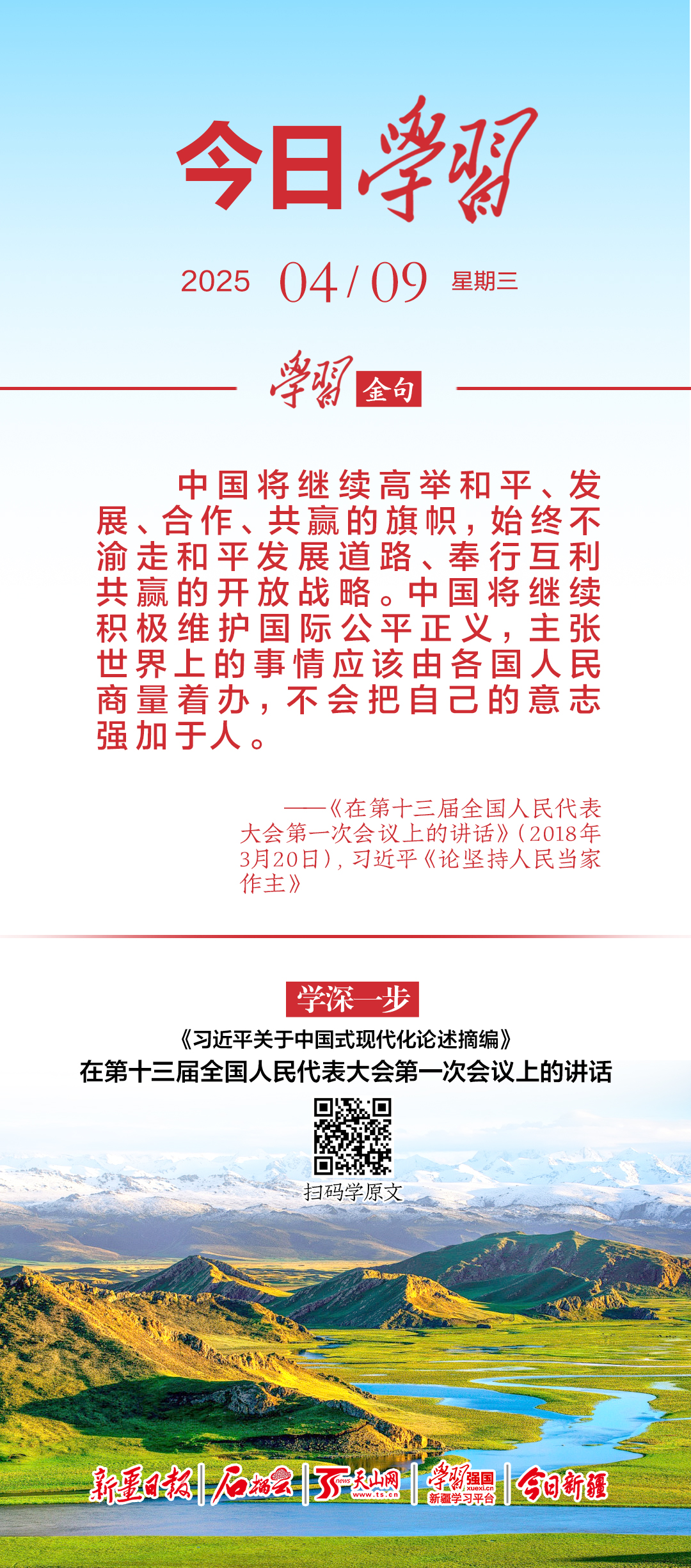 中国将继续高举和平、发展、合作、共赢的旗帜,始终不渝走和平发展道路、奉行互利共赢的开放战略。中国将继续积极维护国际公平正义,主张世界上的事情应该由各国人民商量着办,不会把自己的意志强加于人。