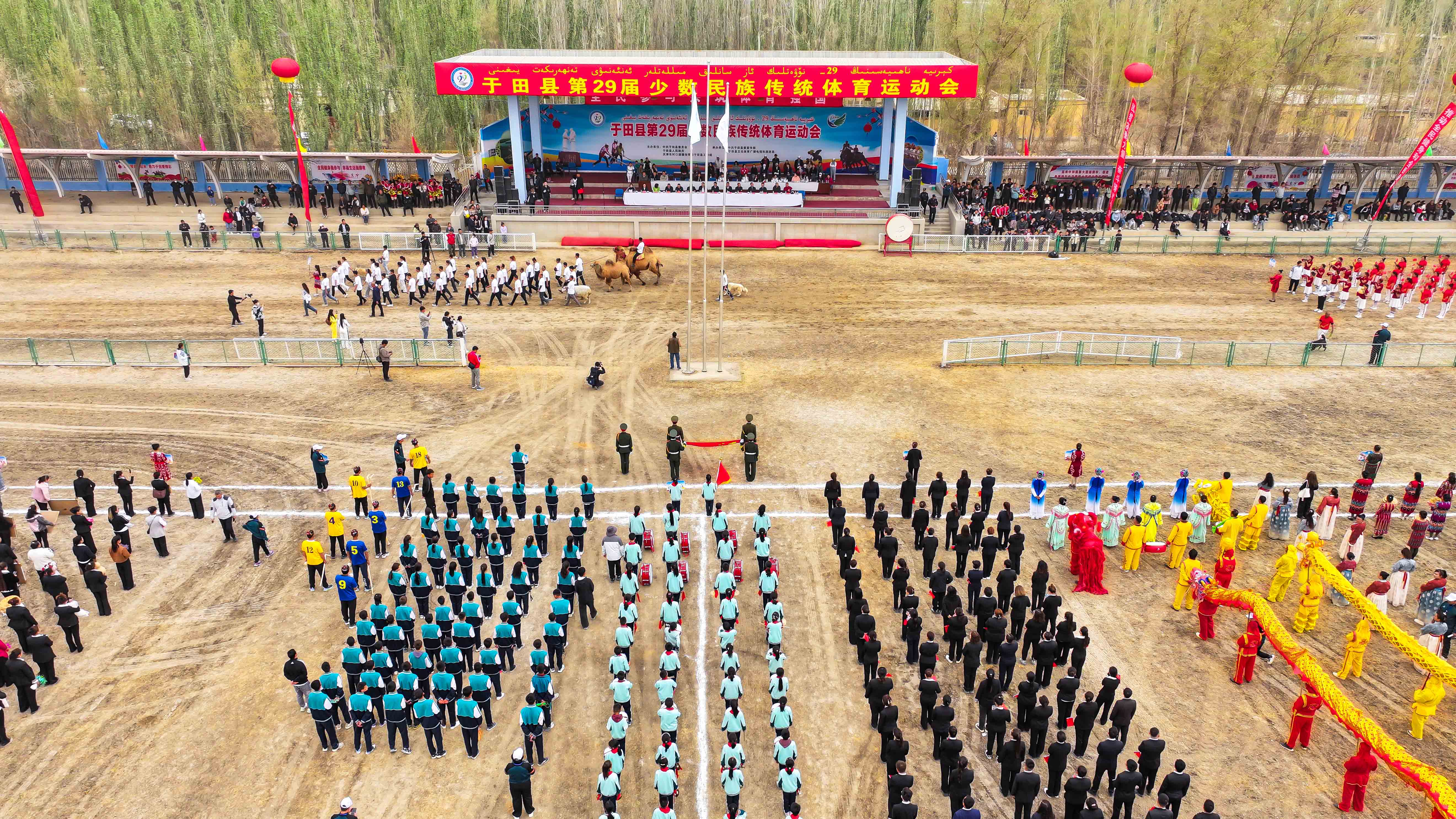 4月12日,于田县先拜巴扎镇农民体育场热闹非凡,第二十九届少数民族传统体育运动会在此盛大开幕。来自全县各乡镇(场、街道)和225团的各族干部群众欢聚一堂,共同见证这一盛事。