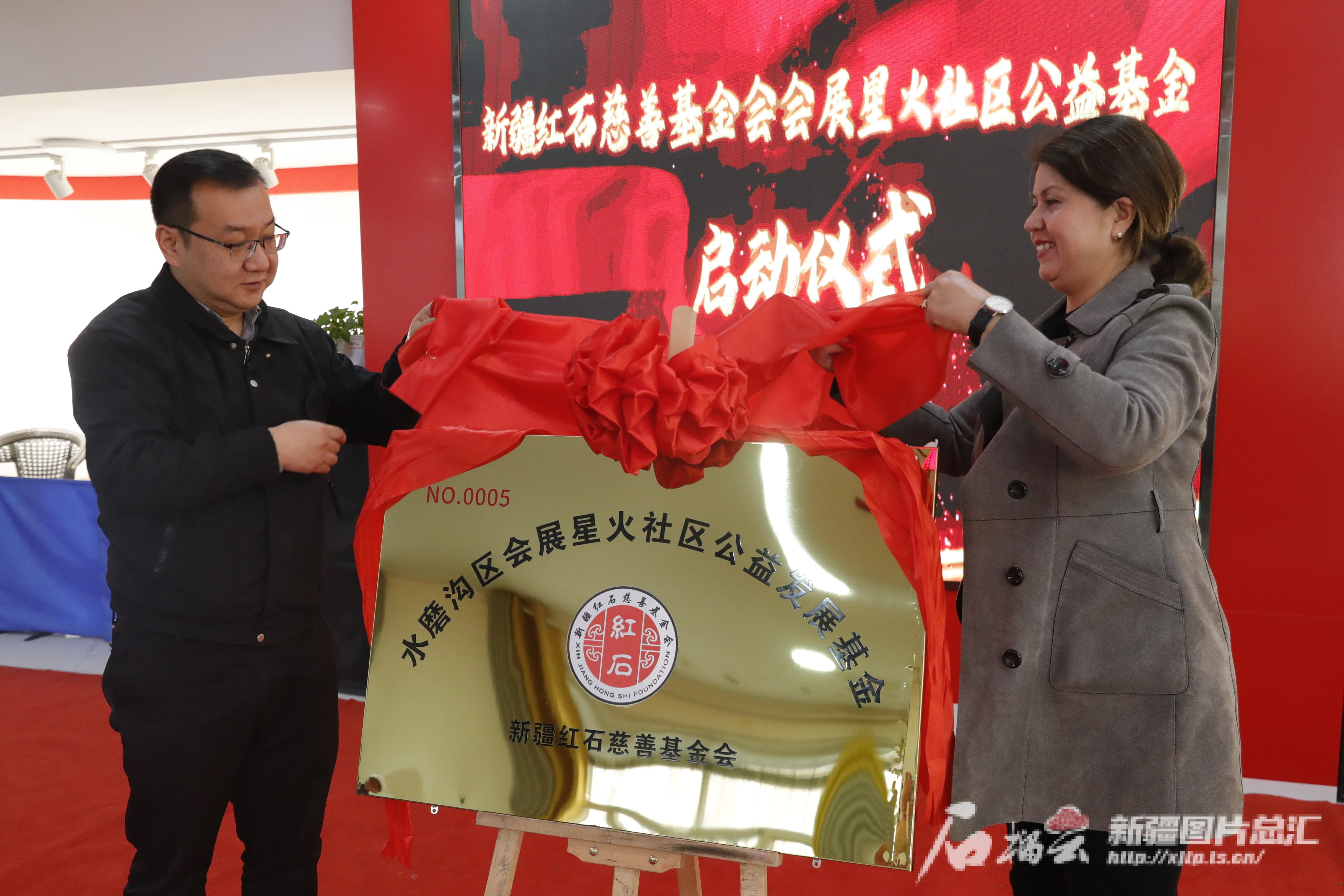 4月17日,乌鲁木齐市水磨沟区七道湾街道主任刘小康(左)与新疆红石慈善基金会项目总监古丽扎提·阿不都热西提为水磨沟区会展星火社区公益发展基金揭牌。记者 秦鹏摄