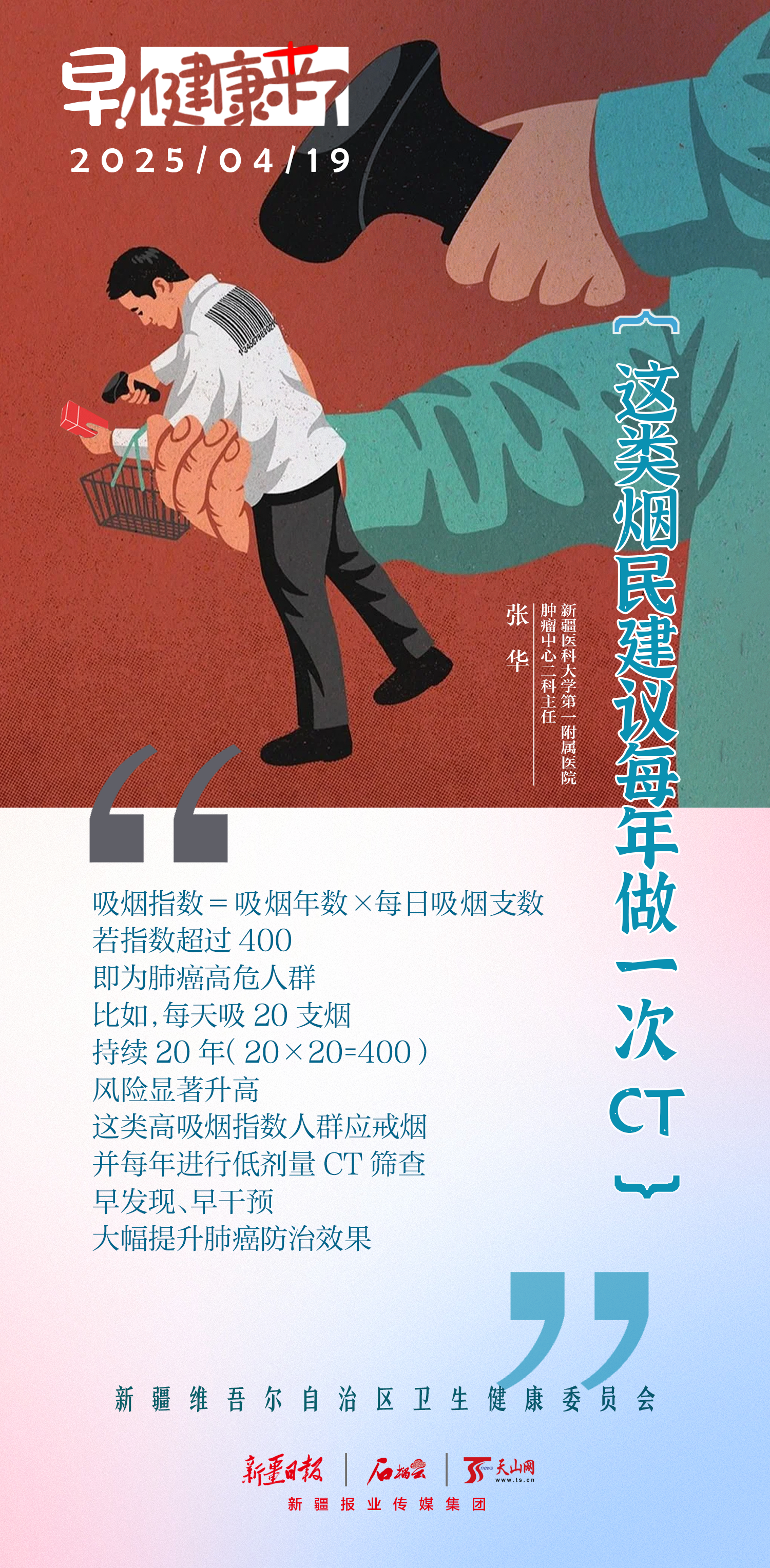 新疆医科大学第一附属医院肿瘤中心二科主任张华提示:每天一包烟,20年后肺癌风险飙升,高吸烟指数人群建议每年进行一次CT检查,早发现、早治疗。
