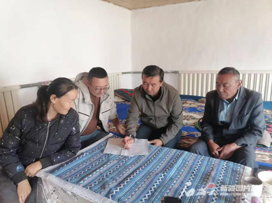 布尔津县科技志愿者木哈买提汗·夏依克(右二)在宣传畜牧兽医技术、动物防疫及治疗知识、养殖户注意事项、生活安全注意事项。图/自治区科协提供