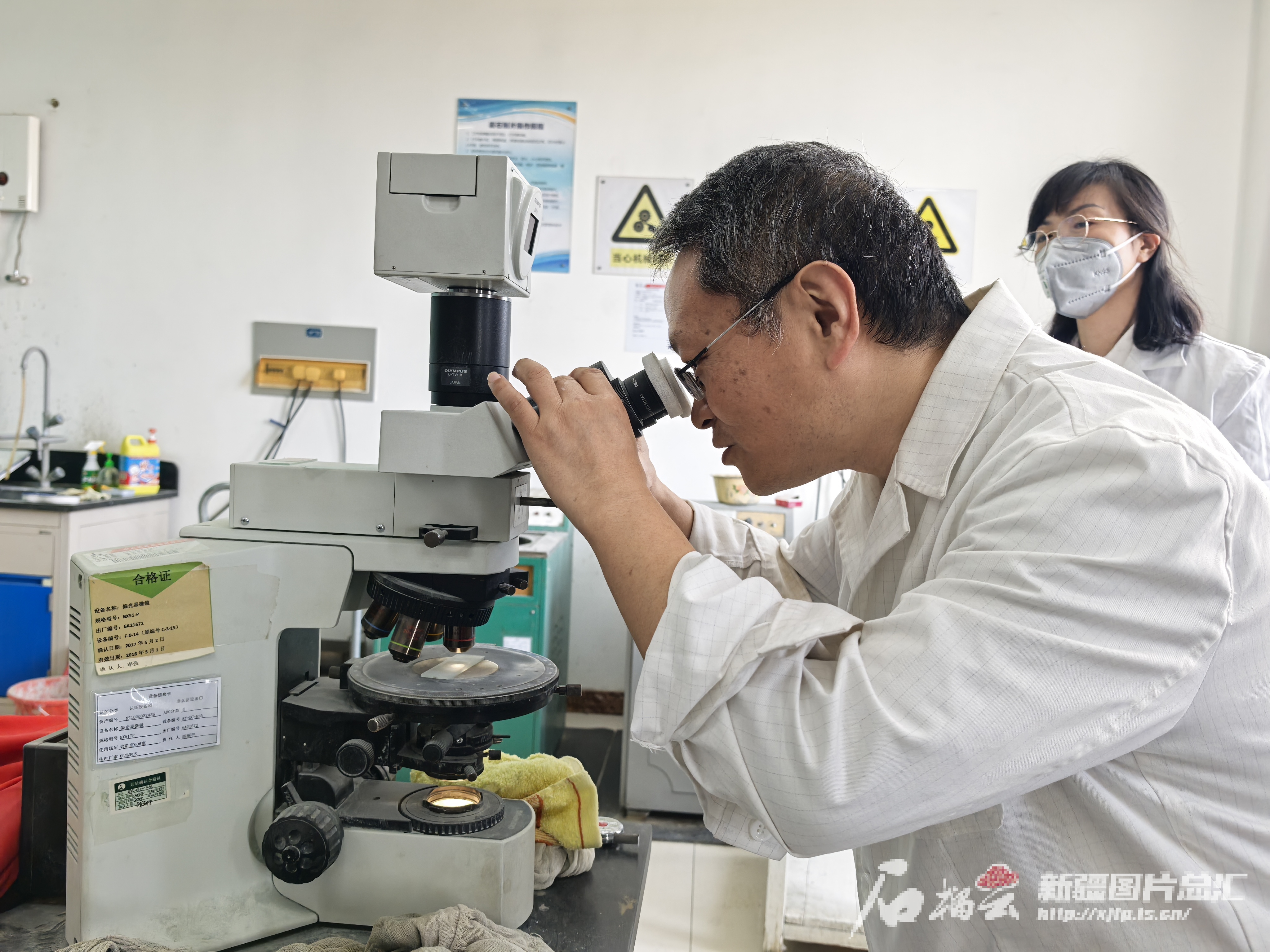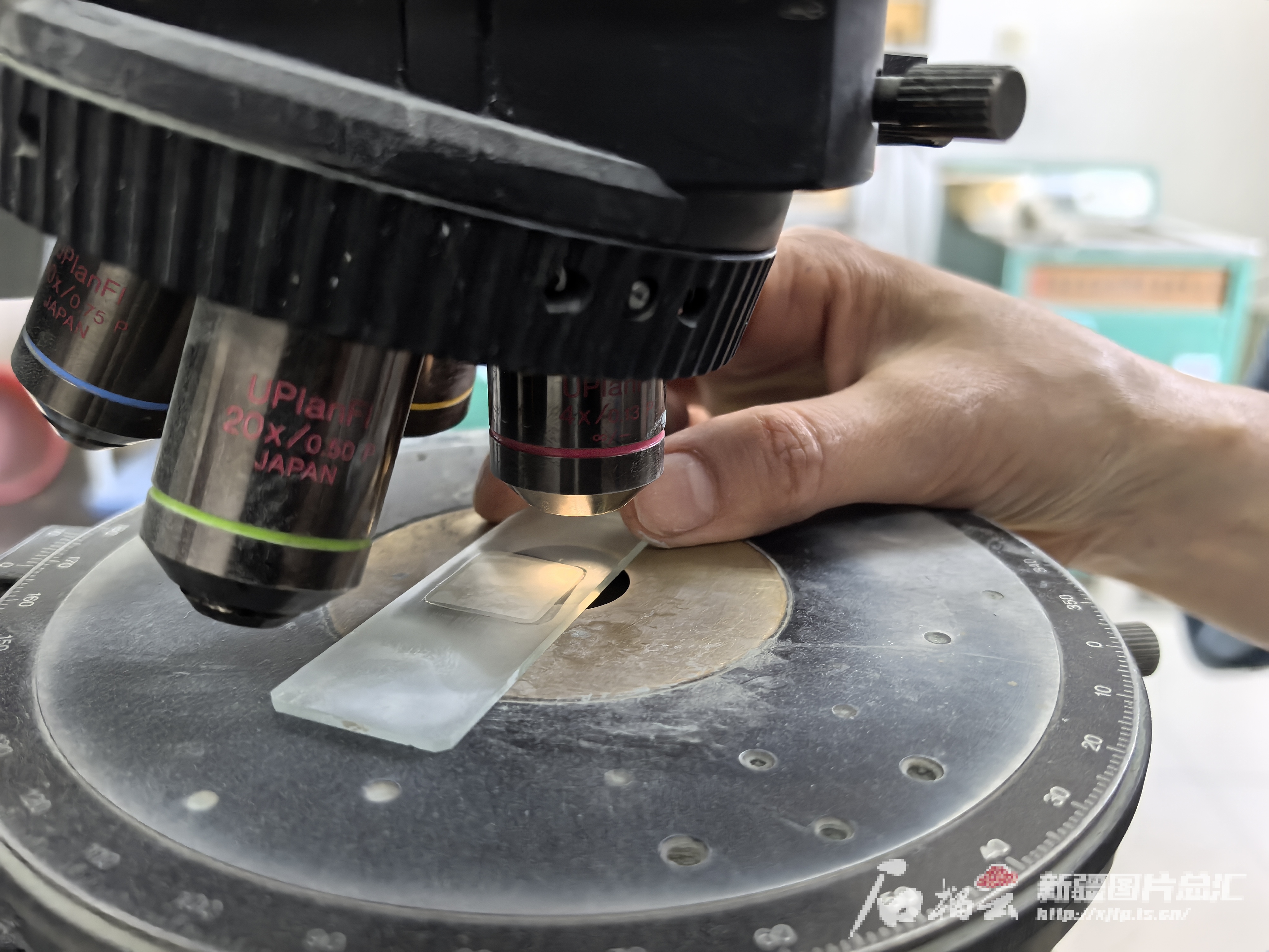 4月14日,检测人员将岩石薄片放在显微镜下,准备观测。石榴云/新疆日报记者于江艳 摄