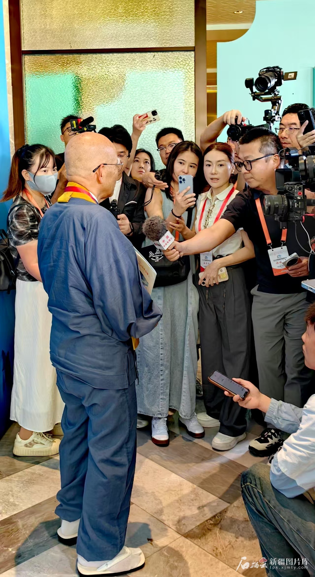 5月25日,小岛康誉先生在2025年新疆旅游发展大会上被媒体记者包围。石榴云/新疆日报记者 高芳摄