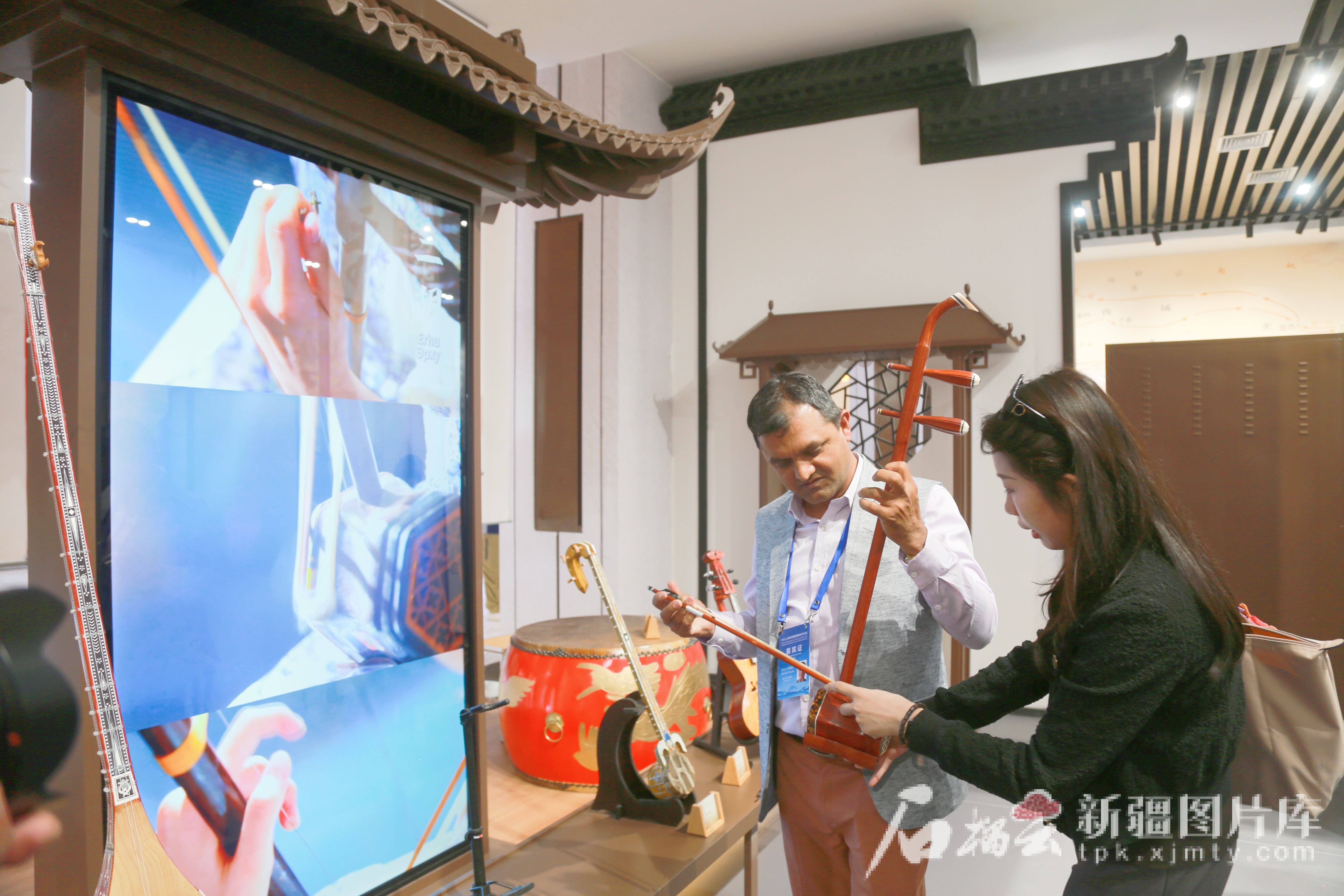 尼泊尔穆尔卡巴尔新闻网总裁桑托什·保德尔在中哈霍尔果斯国际边境合作中心中国文化馆体验二胡演奏。石榴云/新疆日报记者 宋卫国摄