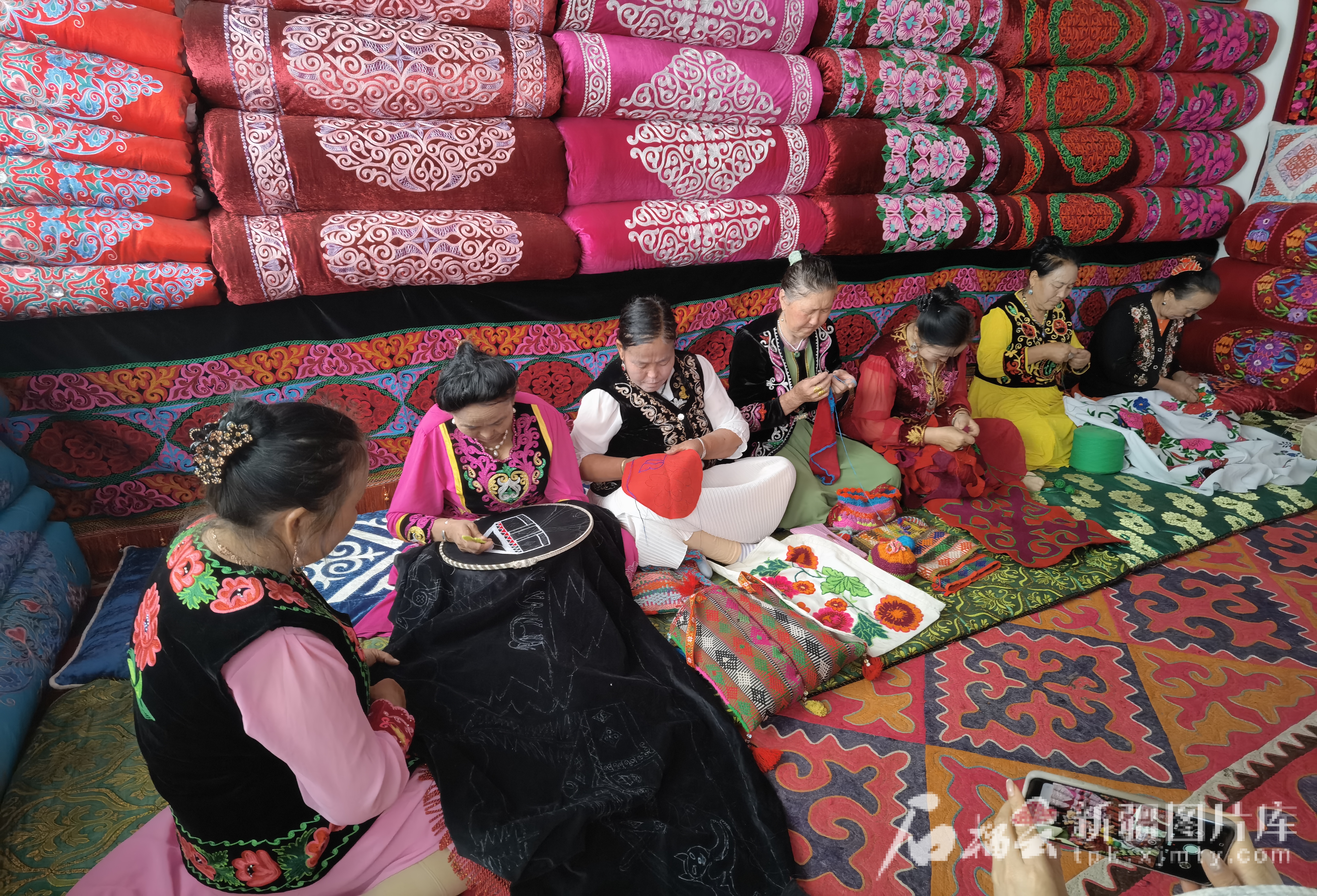 5月21日,在温宿县博孜墩柯尔克孜族乡宝美特柯尔克孜女子手工绣品农民专业合作社内,绣娘们制作刺绣作品。天山网-新疆日报记者 陈疆林摄