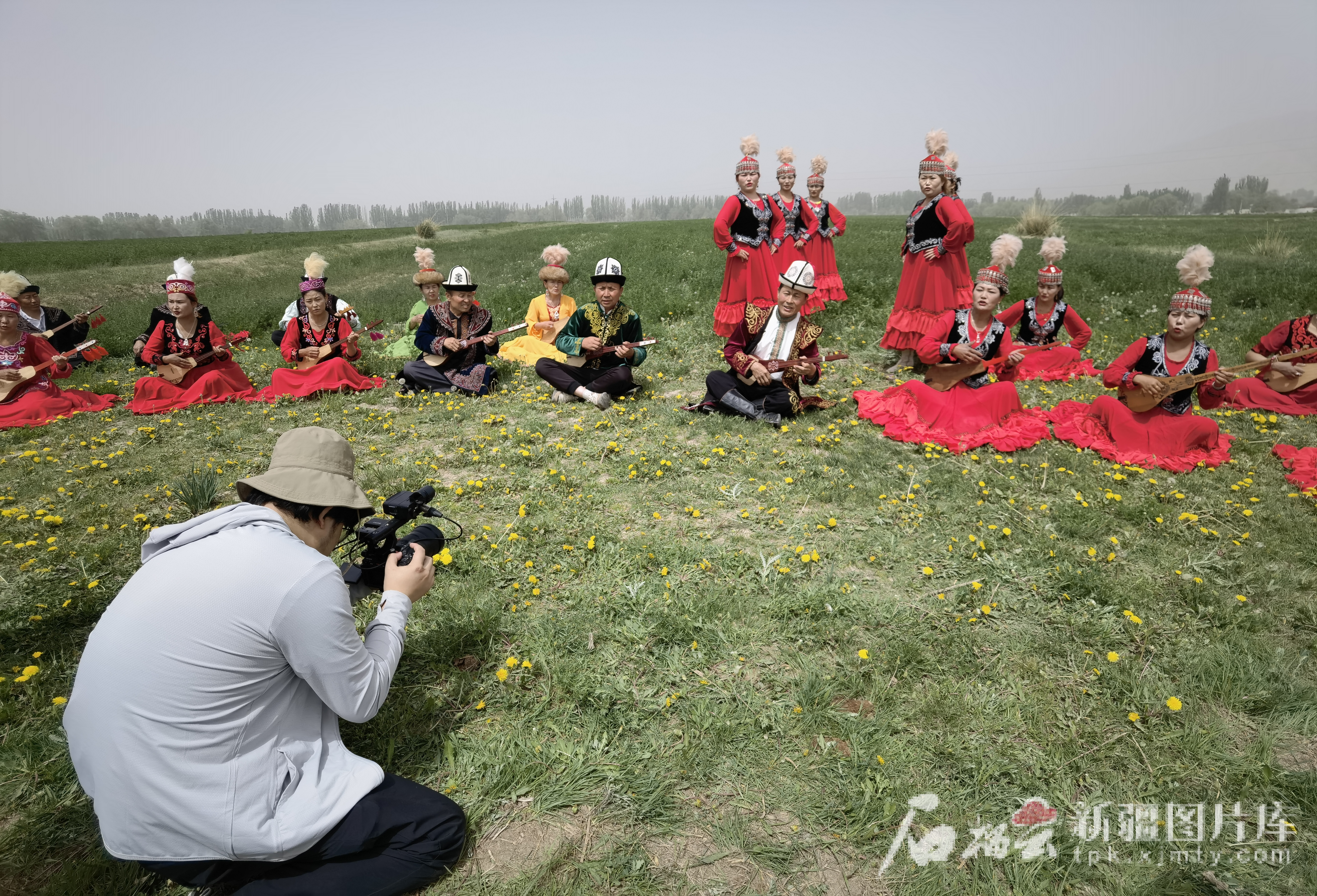 5月21日,在温宿县博孜墩柯尔克孜族乡,玛纳斯奇们正在排练《玛纳斯》,被吸引的游客上前拍照。天山网-新疆日报记者 陈疆林摄
