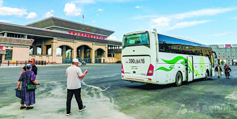 6月30日,游客乘坐的国际旅游大巴从吉木乃口岸入境。得益于中哈免签政策和不断完善的口岸服务,今年前5月,吉木乃海关验放出入境人员超3万人次。天山网-新疆日报记者蔡增乐摄