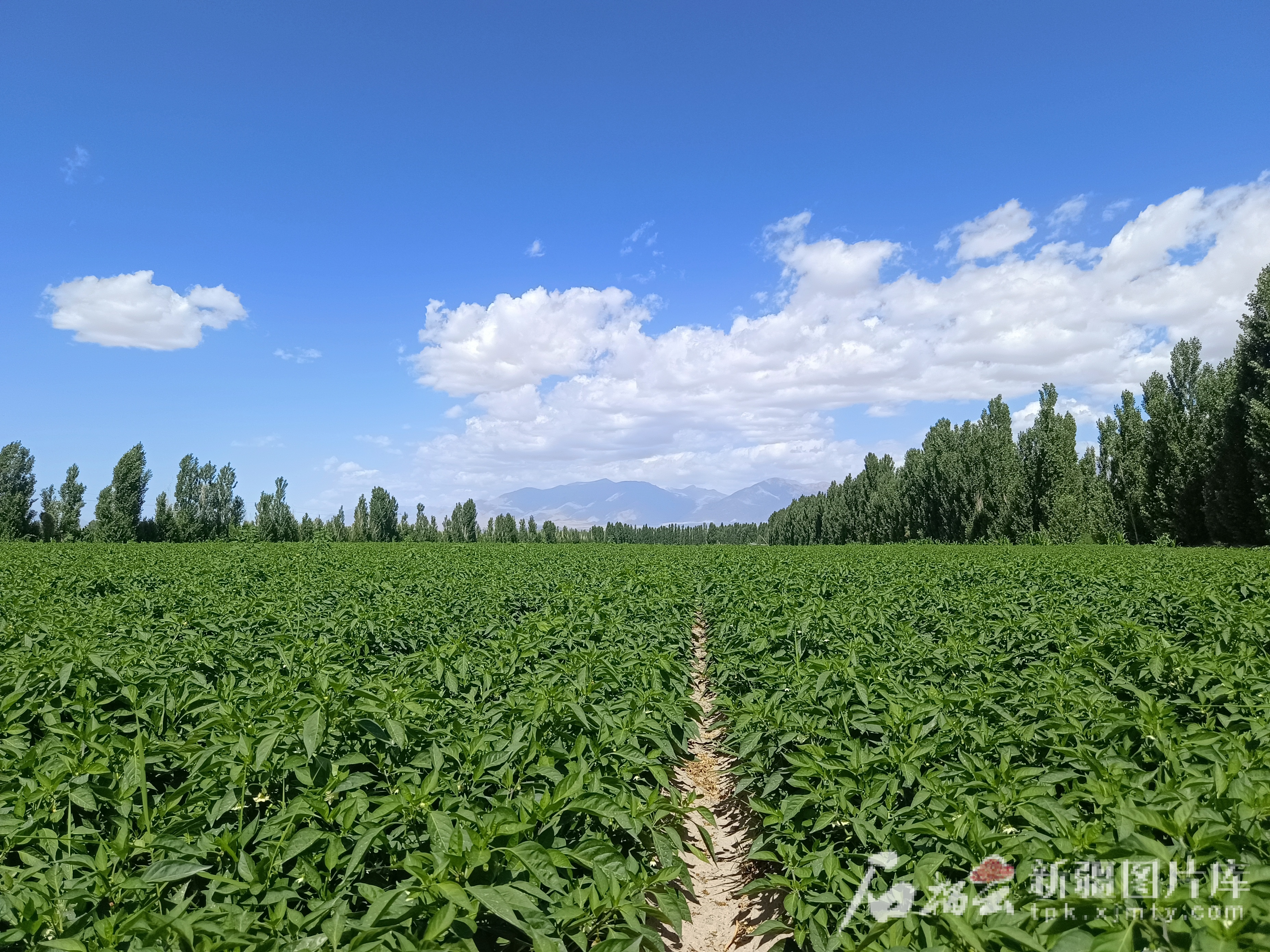 7月2日,和静县哈尔莫敦镇哈尔莫敦村的辣椒田像绿色的地毯铺向远方。天山网-新疆日报记者 杜建辉摄