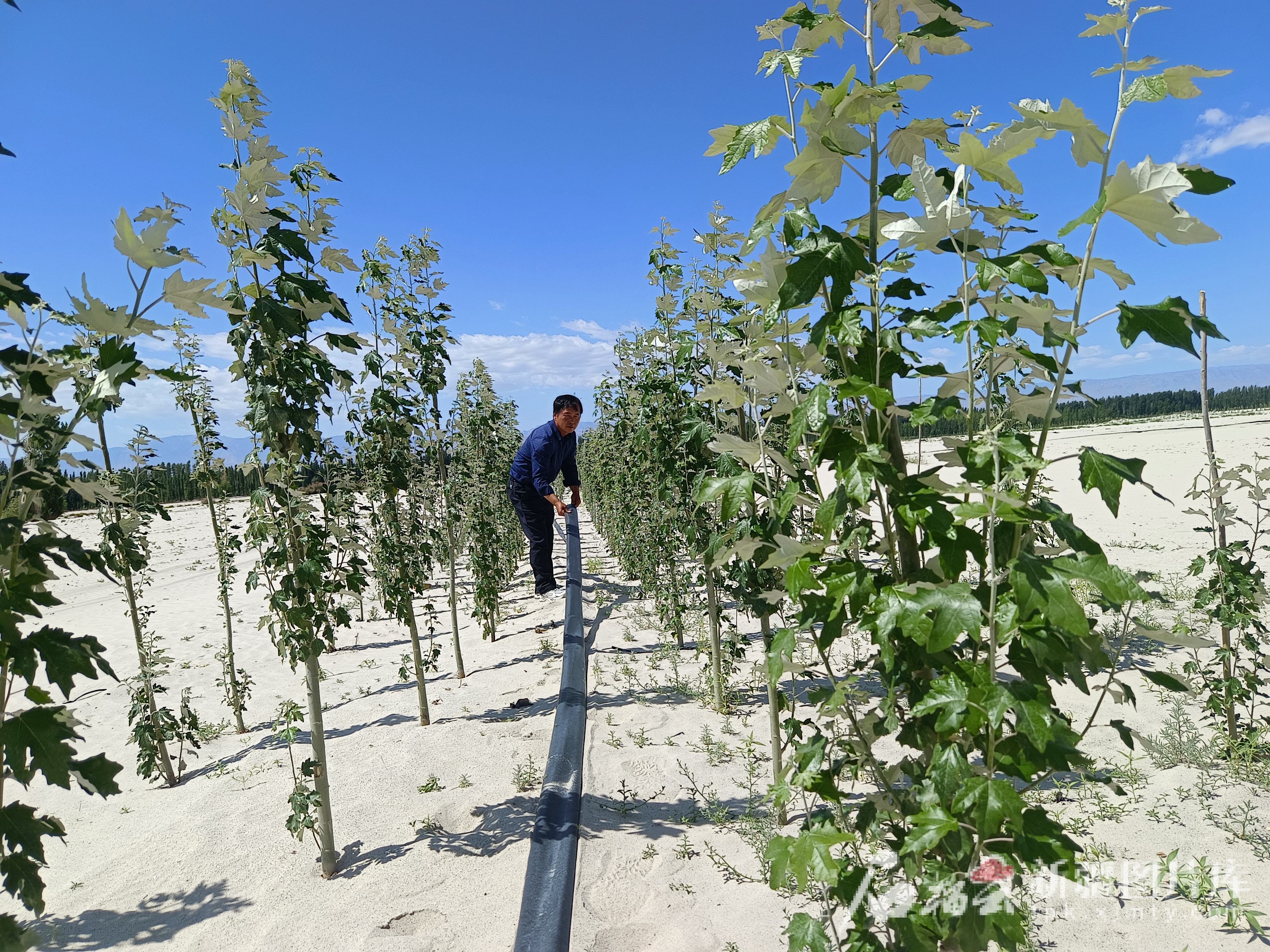 7月2日,付国喜准备给今年春天栽种的树苗浇水。天山网-新疆日报记者 杜建辉摄
