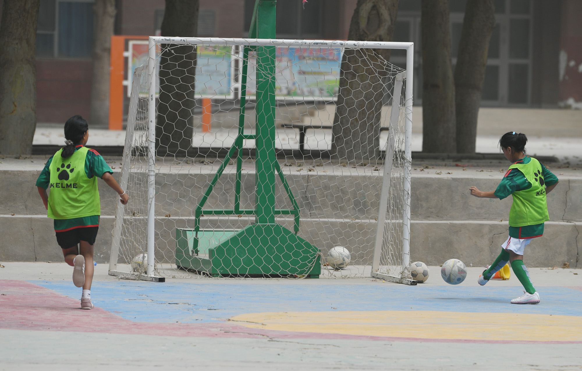 7月10日,皮山县乔达乡中心小学女子足球队队员在进行射门训练。