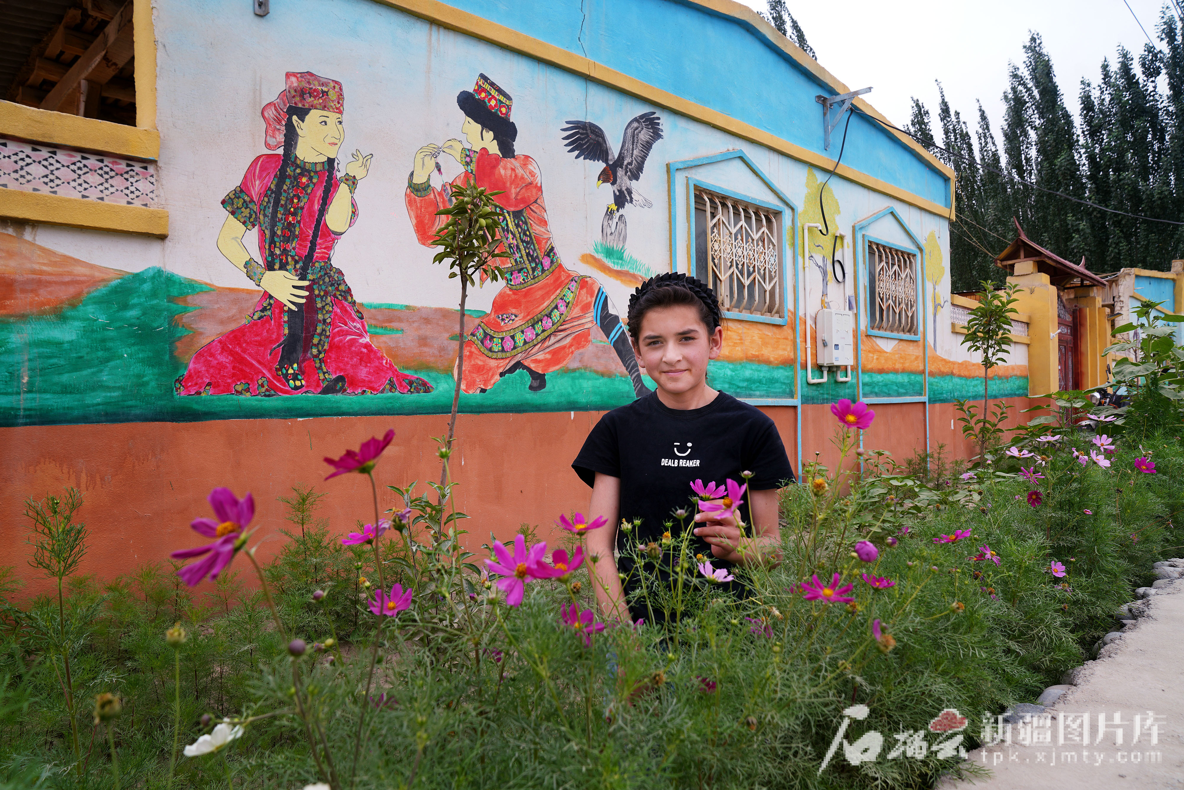 7月9日,在皮山县垴阿巴提塔吉克族乡康阿孜村,一名小朋友在路边拍照。