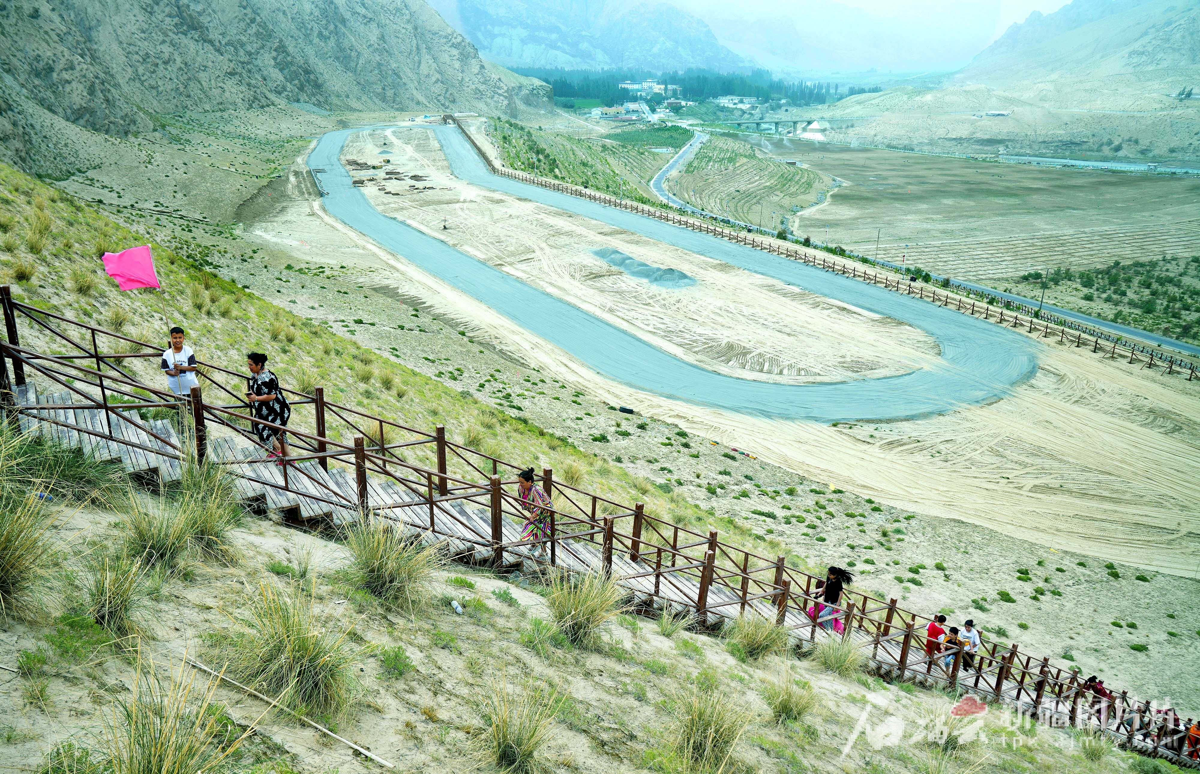 7月9日,站在皮山县垴阿巴提塔吉克族乡康阿孜村的“爱情天梯”景点,刁羊赛马场、百亩雪菊园和村子尽收眼底。