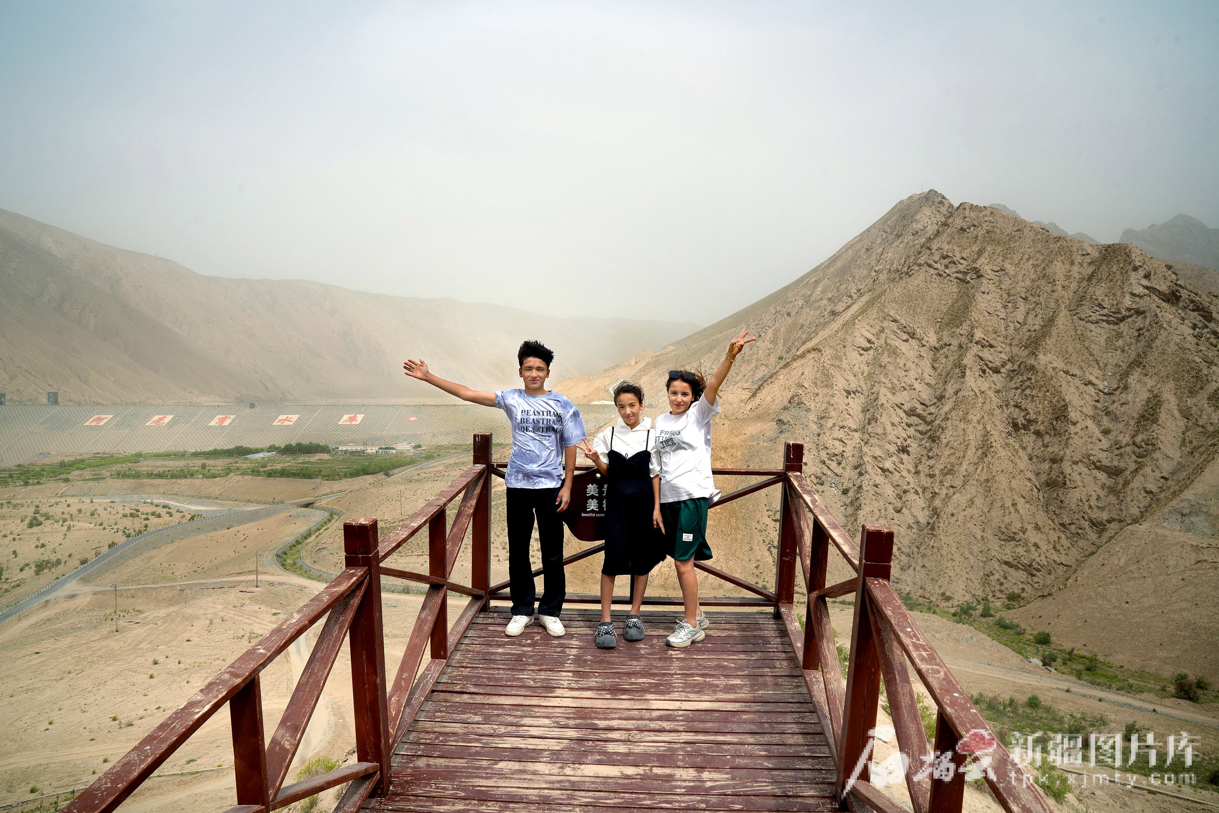7月9日,在皮山县垴阿巴提塔吉克族乡康阿孜村的“爱情天梯”景点,游客们在木栈道顶端拍照。