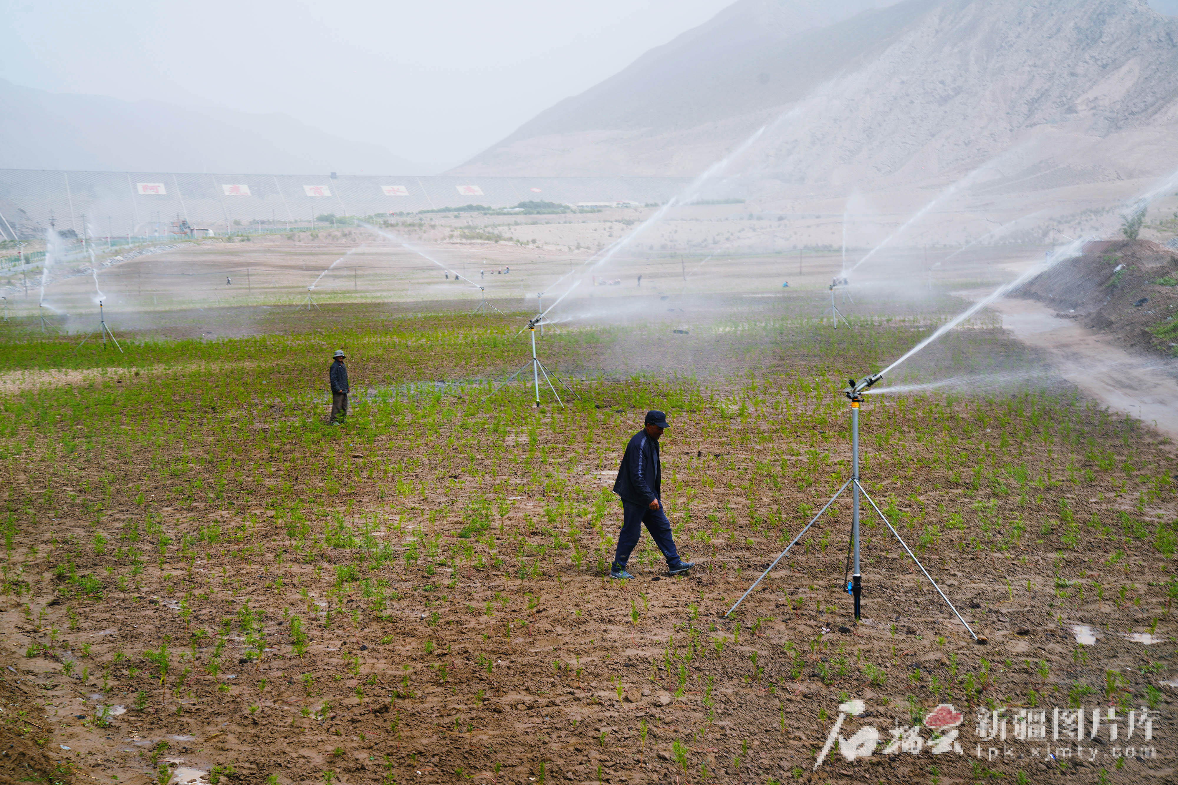 7月9日,在皮山县垴阿巴提塔吉克族乡康阿孜村新建的百亩雪菊园里,绿苗已经出土。