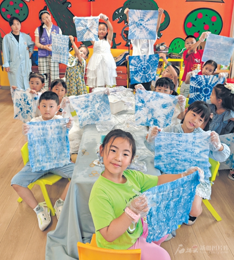 7月6日,在乌鲁木齐市水磨沟区南湖北路邻里中心,周边社区的孩子们围坐在一起,在专业老师的指导下学习扎染技艺。