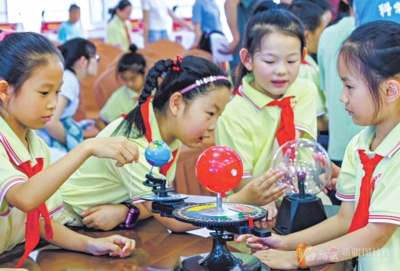 7月5日,乌鲁木齐经济技术开发区(头屯河区)嵩山街街道西湖社区的孩子们在体验地球和太阳公转实验。邢东摄