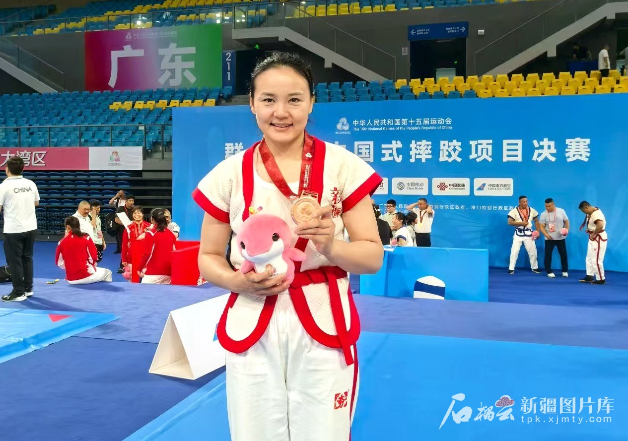 在刚刚结束的第十五届全国运动会群众比赛中国式摔跤决赛阶段,她作为新疆队唯一的女子运动员,在女子70公斤级比赛中闯入半决赛,并获得一枚铜牌。