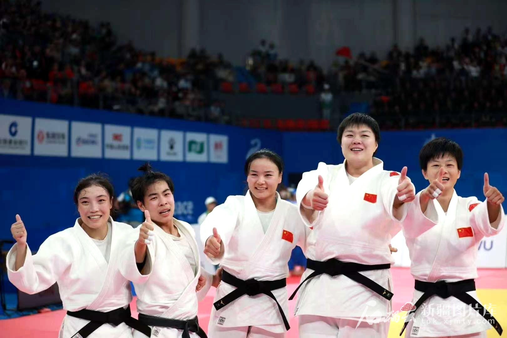 哈尔哈勒什·努尔巴哈提(中)与队友夺得第七届世界军人运动会柔道女团冠军。本人提供