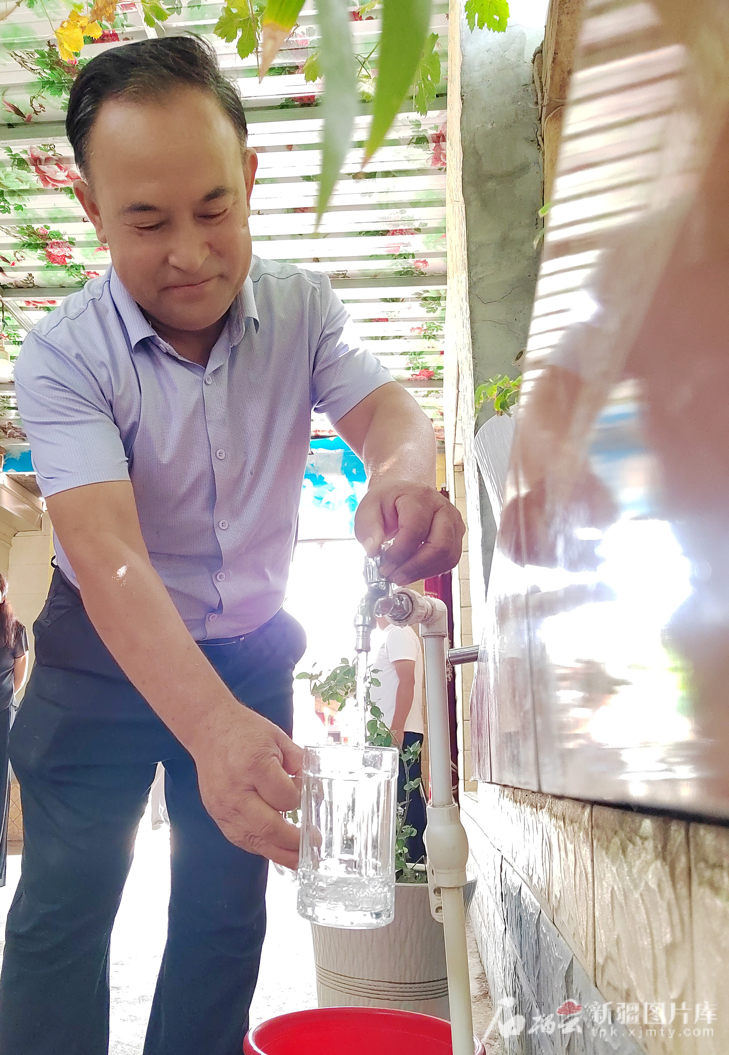 8月8日,伽师县居仁镇开旦木加依村村民艾尼玩尔·热依木在接自来水。