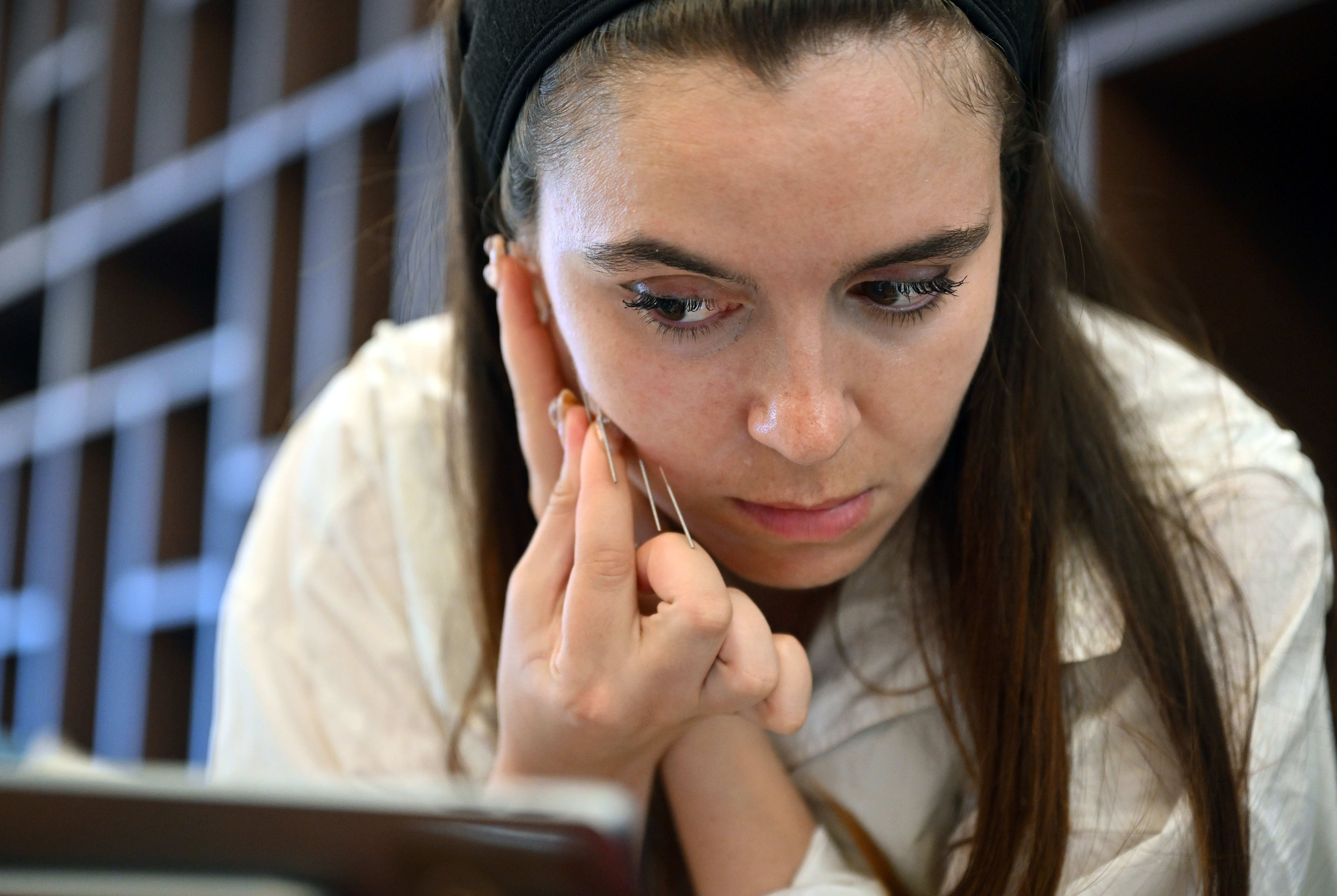 8月7日,外国学员在海南省三亚市练习针灸。