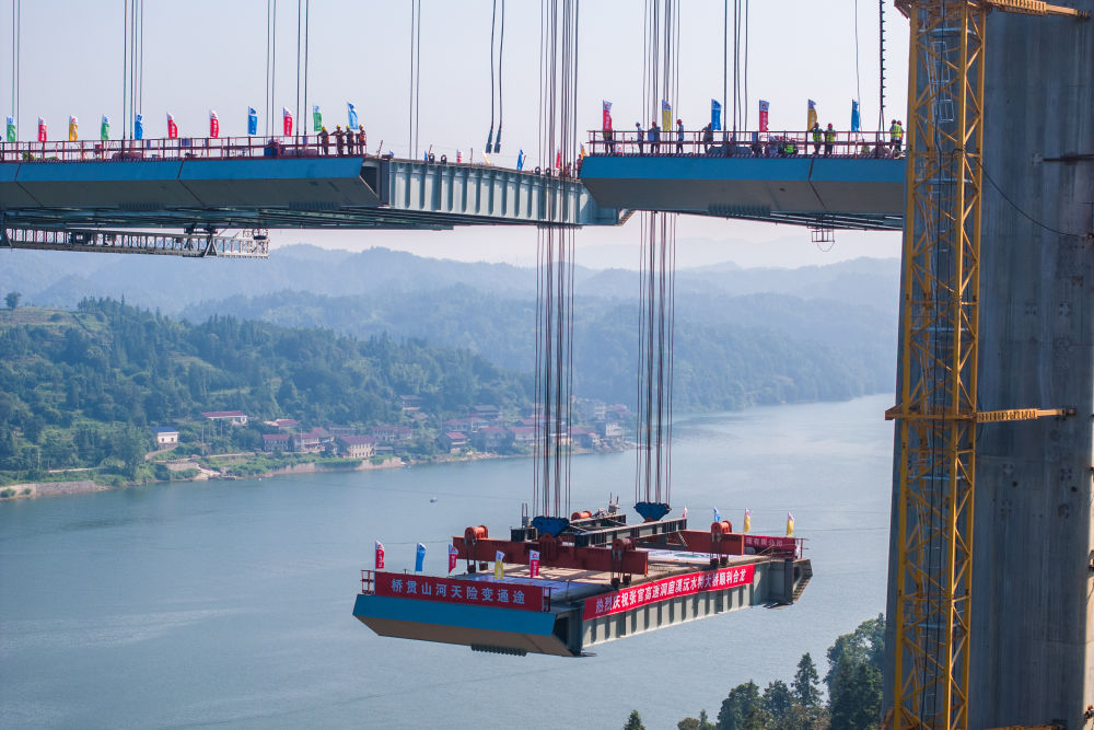 8月3日,在张官高速洞庭溪沅水特大桥施工现场,一块钢混结合梁在被缓缓提升(无人机照片)。