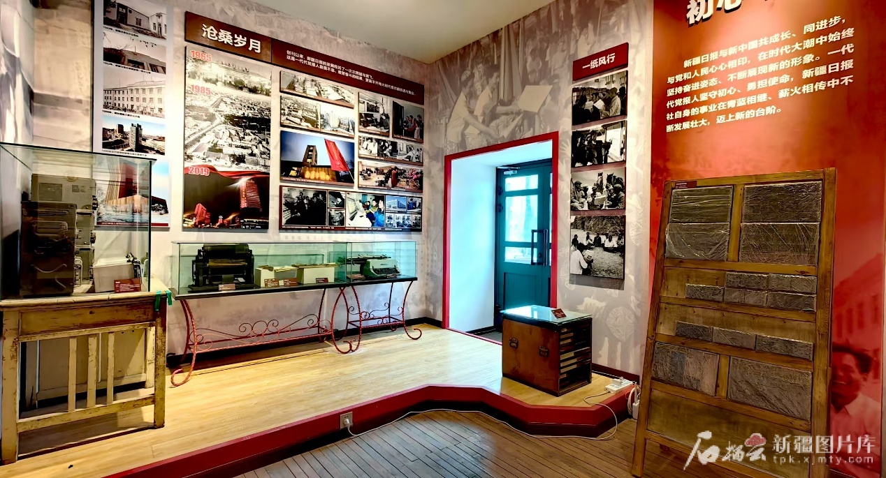 新疆日报报史馆一隅展示的报纸印刷变迁。记者 高芳摄