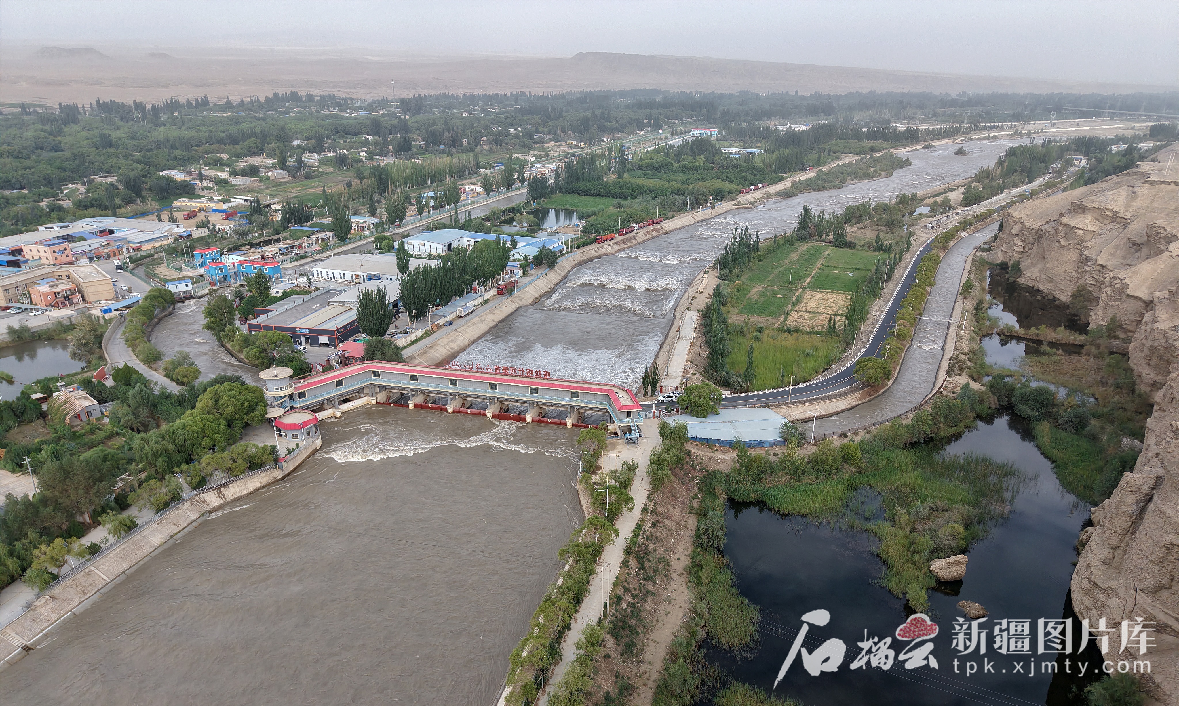 俯瞰位于墨玉县萨依巴格乡渠首村的喀拉喀什河渠首工程(8月6日无人机摄)。