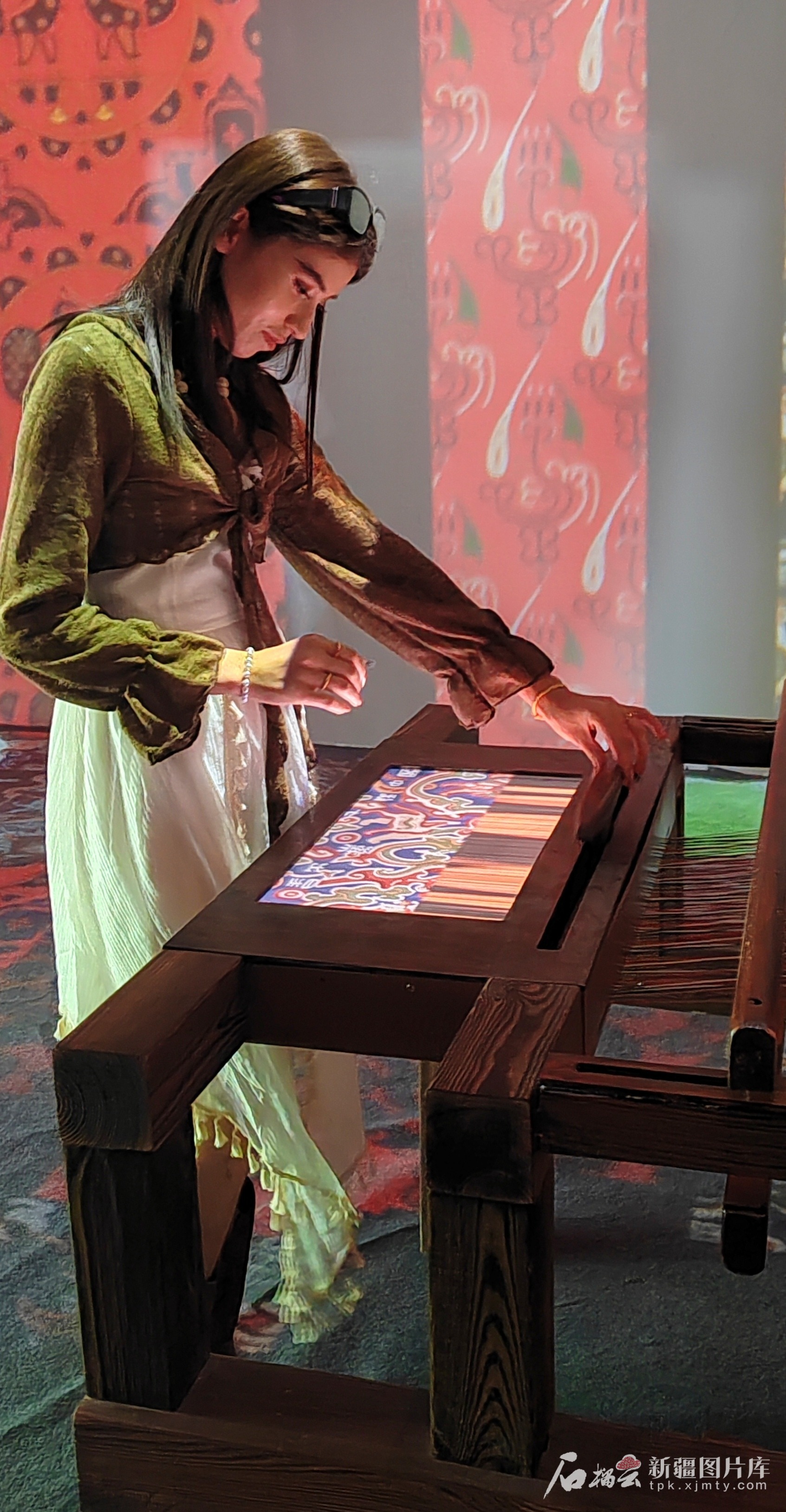 8月15日晚,2025“新疆是个好地方”非遗援疆主题展示活动现场,观众在“织造锦梦”沉浸式织机前进行互动体验。天山网-新疆日报记者 贾春霞摄
