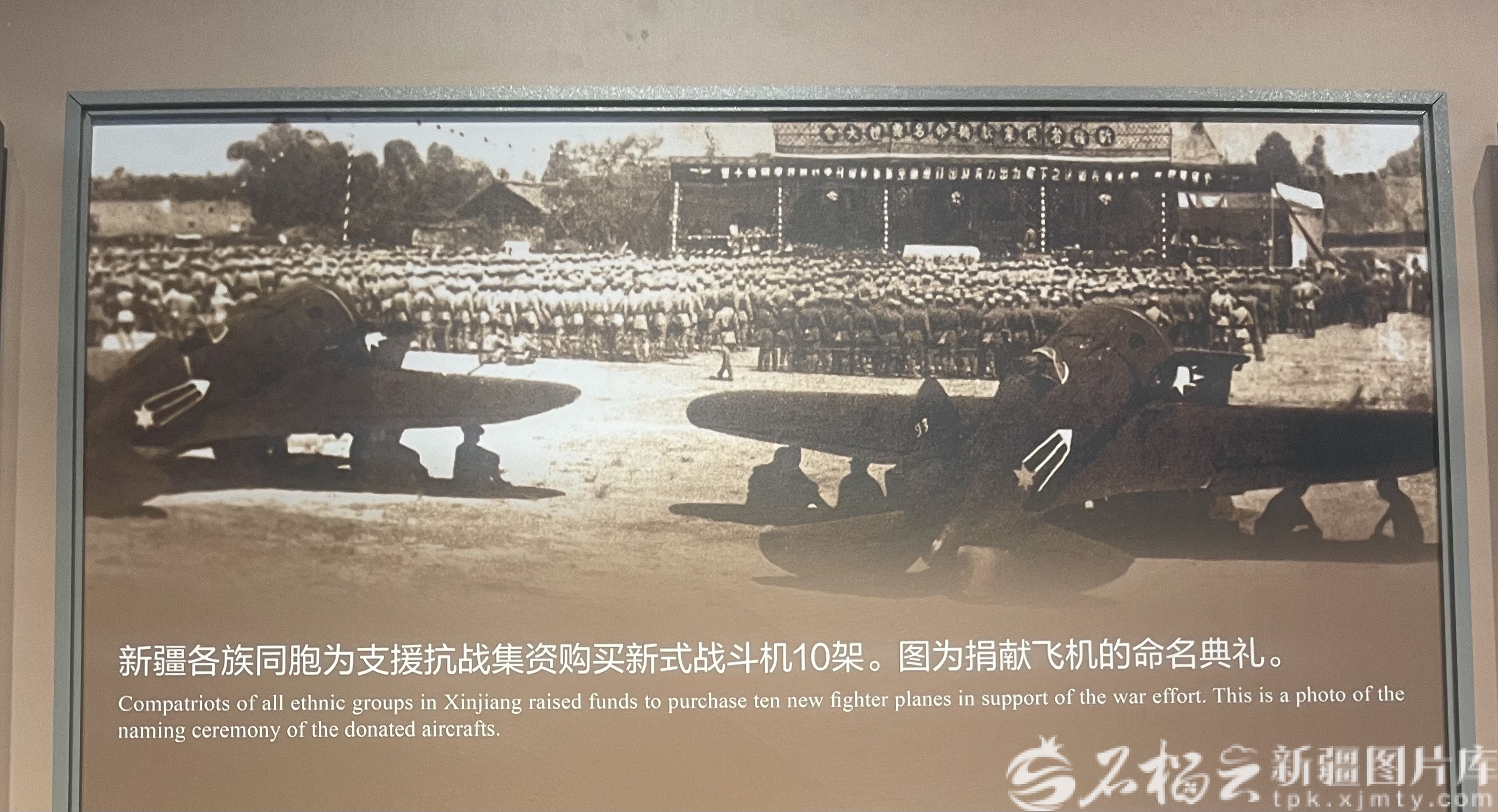 中国人民抗日战争纪念馆展出的新疆各族同胞为支援抗战集资购买新式战斗机10架照片。石榴云/新疆日报记者 刘翔摄
