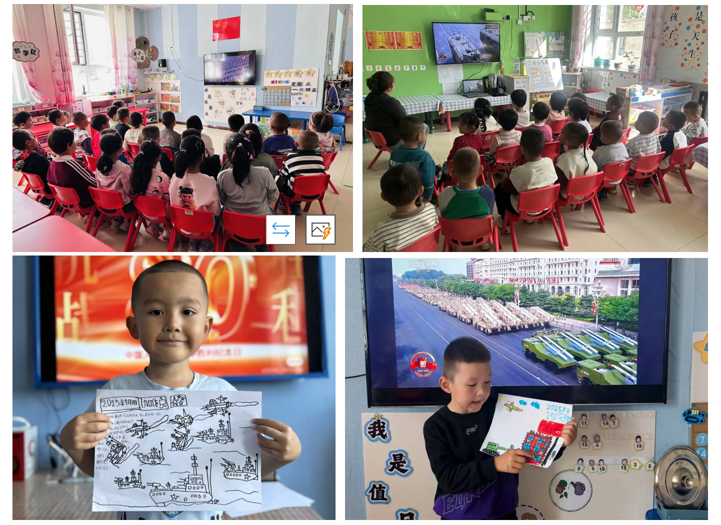 为引导幼儿铭记历史、缅怀先烈、珍爱和平、开创未来,9月2日,阿勒泰市红墩镇中心幼儿园各班老师通过绘本、动画片段、实物教具和情景剧等方式,帮助孩子们理解什么是大阅兵及意义。9月3日上午,各班师生在教室观看大会直播,观看中适时讲解,当看到受阅官兵迈着正步通过天安门广场时,孩子们自发鼓掌,感受到了国家的强大与阅兵式的庄严。观看结束后,孩子们将最难忘的瞬间画下来,有的画了整齐的军人队伍,有的画了飞机方阵,还有的画了五星红旗,分享时孩子们讲述着自己的作品。通过本次活动将宏大的历史叙事转化为幼儿可感知的教育场景,实现了爱国主义教育的启蒙价值,为孩子们的健康成长注入宝贵的精神养分。