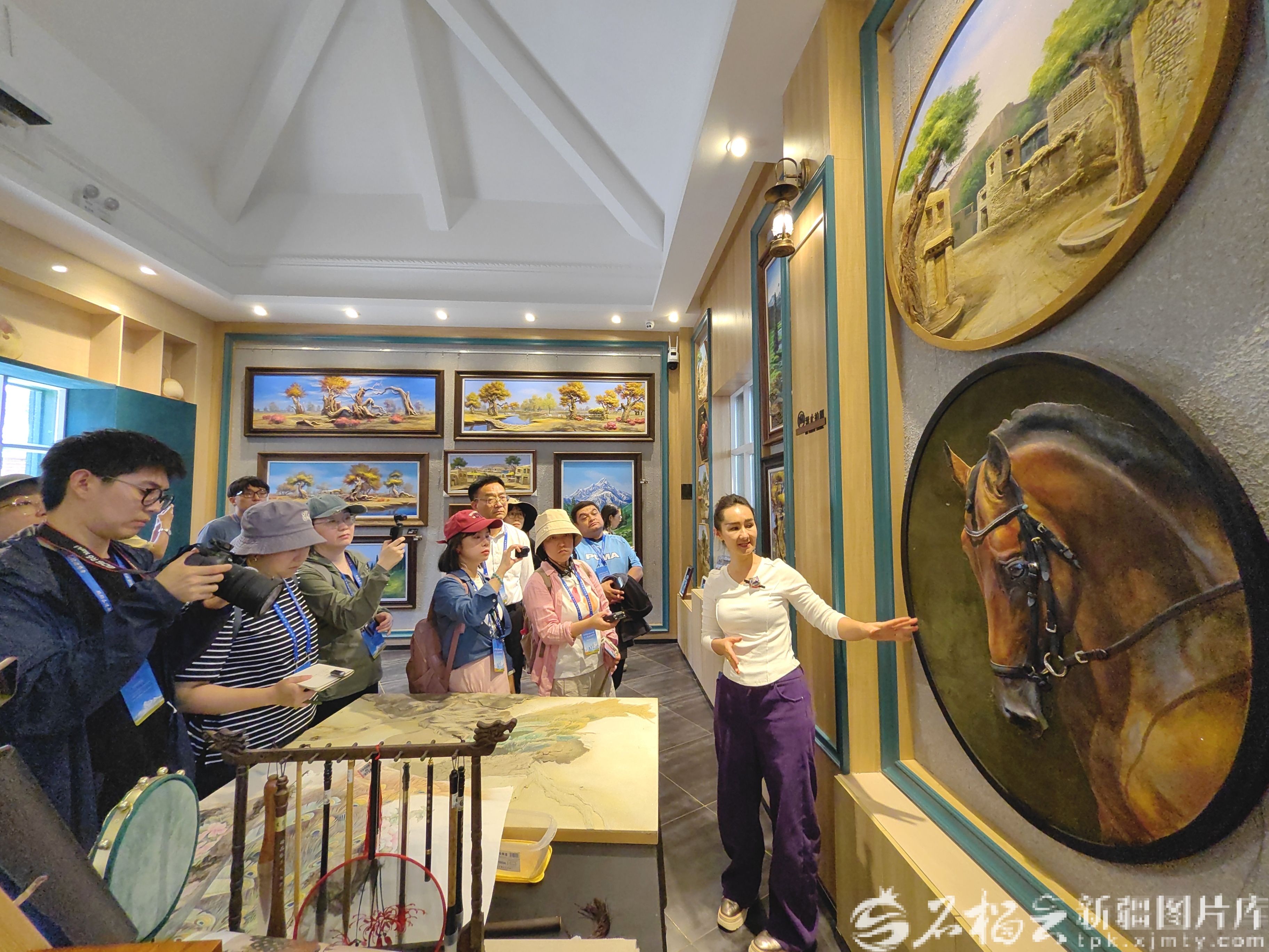 9月8日,采访团在伊宁市六星街景区彩石画展览工作基地采访。