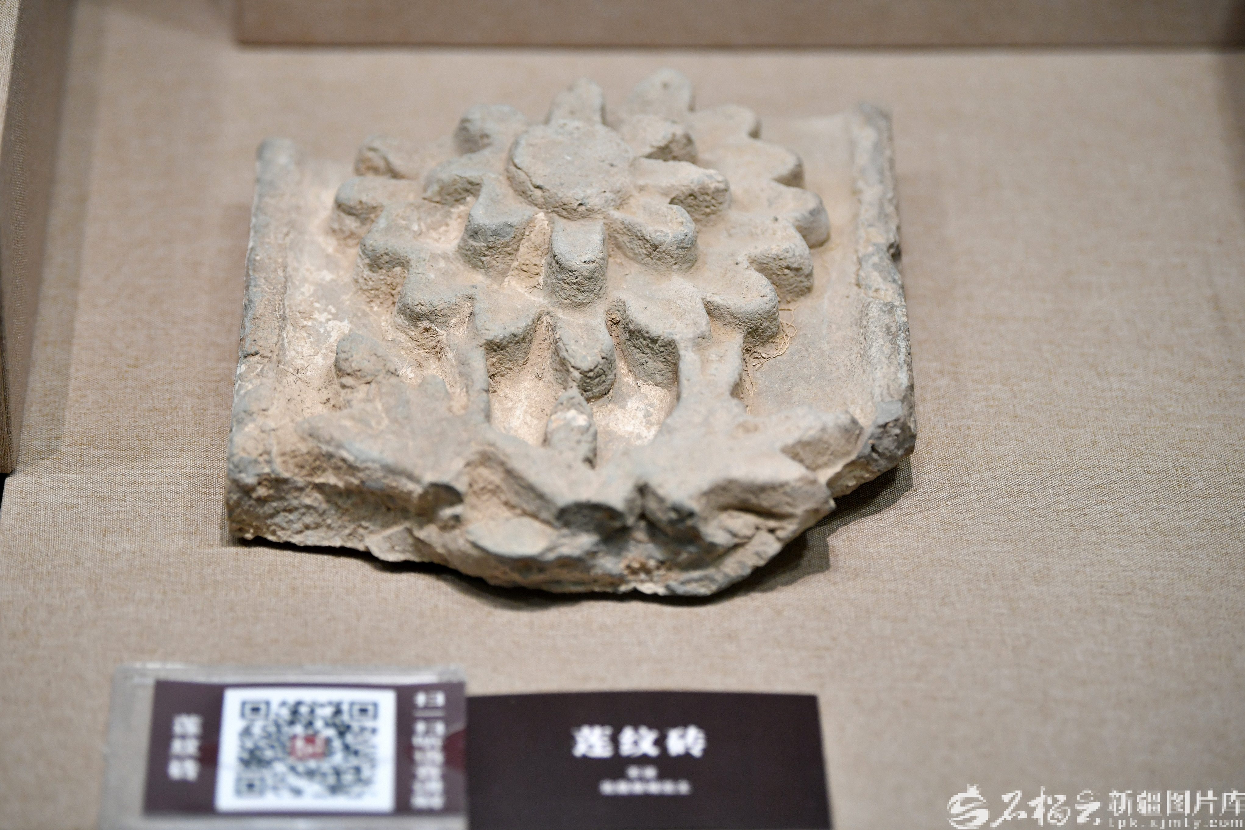 9月9日,丝绸之路北庭故城遗址博物馆展出北庭故城遗址出土的唐代莲纹砖。