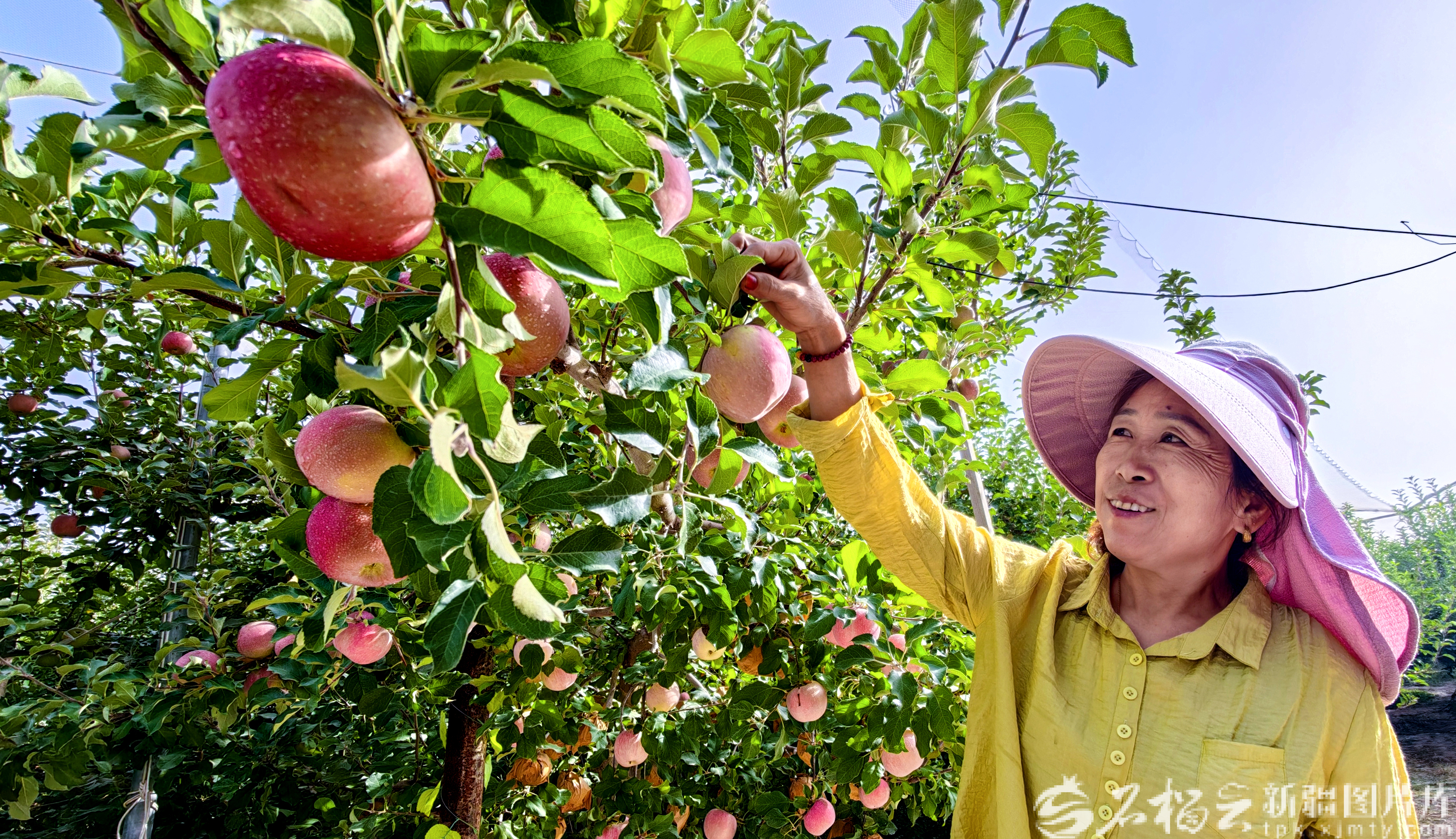 9月11日,一名农民在阿克苏市丰庆园果品农民专业合作社苹果园内观察苹果长势。