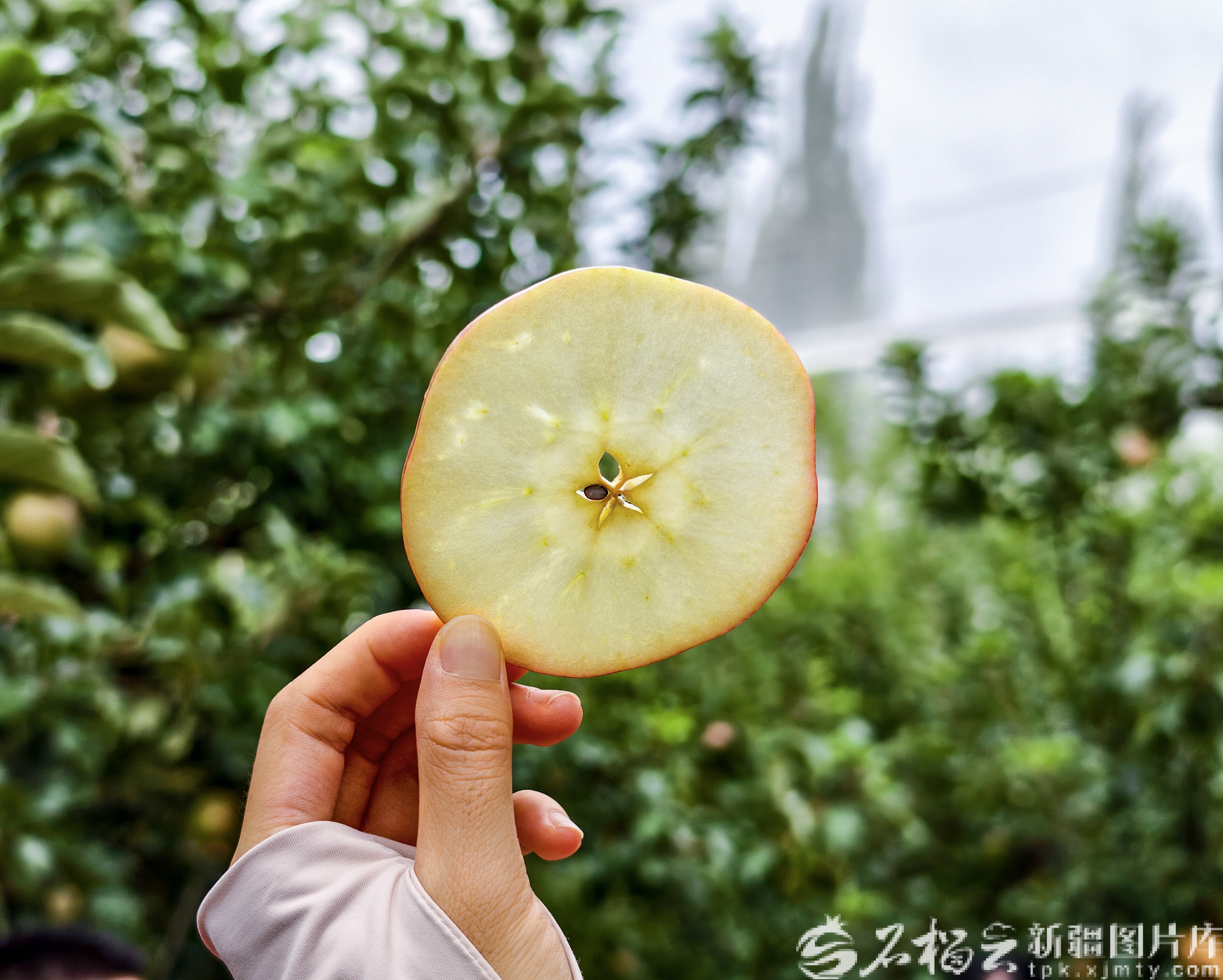 9月11日,一名参观者在丰庆园果品农民专业合作社苹果园内展示切片的苹果。