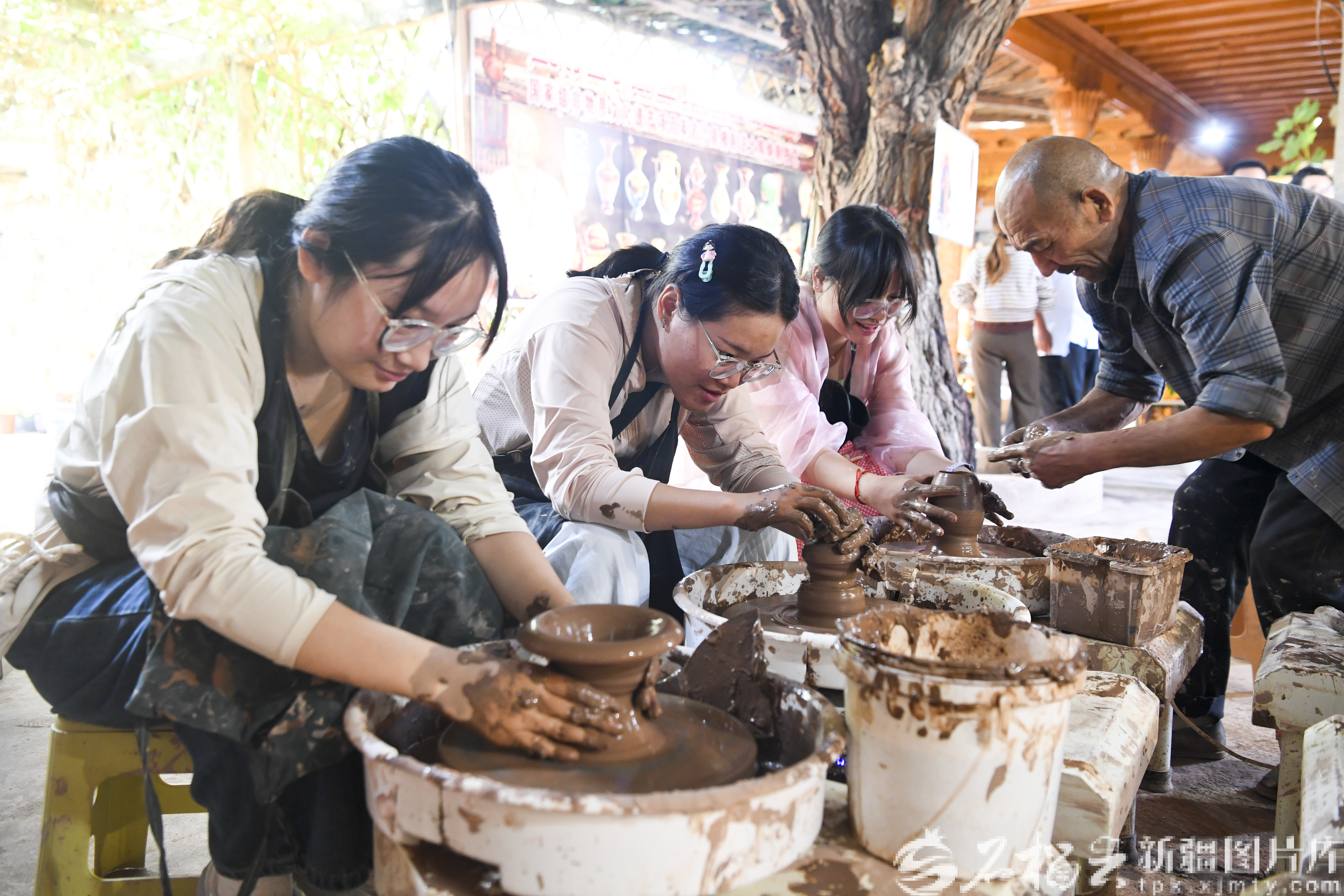 天山网-新疆日报讯(记者汤永摄影报道)9月11日,英吉沙县土陶村迎来众多游客,非遗项目体验成热门。在土陶展览馆,造型别致的土陶产品吸引眼球,体验区内,来自湖北的褚晓丽等游客亲手制作土陶,感受非遗魅力。“听说英吉沙土陶很有名,特意来体验,动手制作感觉非常棒!”褚晓丽说。