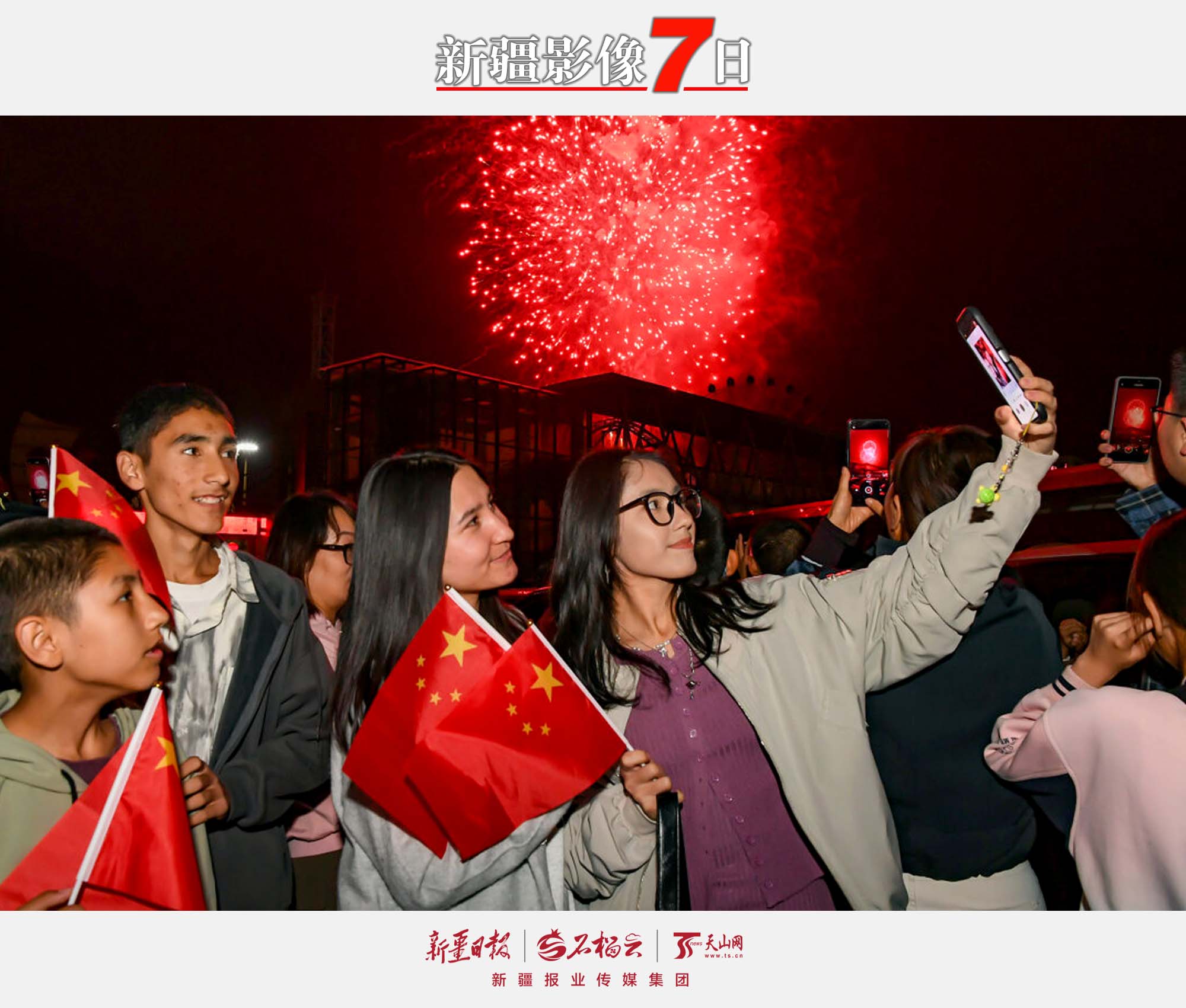 10月1日,人们在乌鲁木齐市水上乐园燃放的焰火合影留念。当晚乌鲁木齐2025年“家国共此时,光焰耀天山”大型焰火燃放活动在乌鲁木齐市水上乐园举行。天山网-新疆日报记者 约提克尔·尼加提 摄