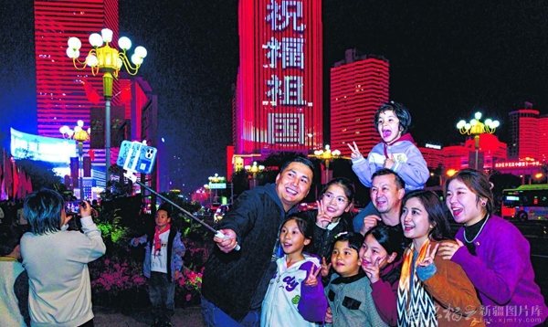 10月4日,市民在乌鲁木齐市西大桥拍照留念。夜幕降临,西大桥附近的楼宇间以“党的光辉照天山”“各族人民心向党”“建设美丽新疆”等字样组成的灯光秀,吸引了众多市民前来打卡拍照。孙振嵩摄