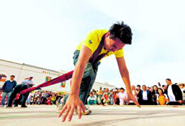 10月1日,选手在参加押加比赛。当日,库车市举行“群众力量”比赛活动,包括拔河、踢毽子、押加等项目,吸引各行各业的群众积极参与。袁欢欢摄