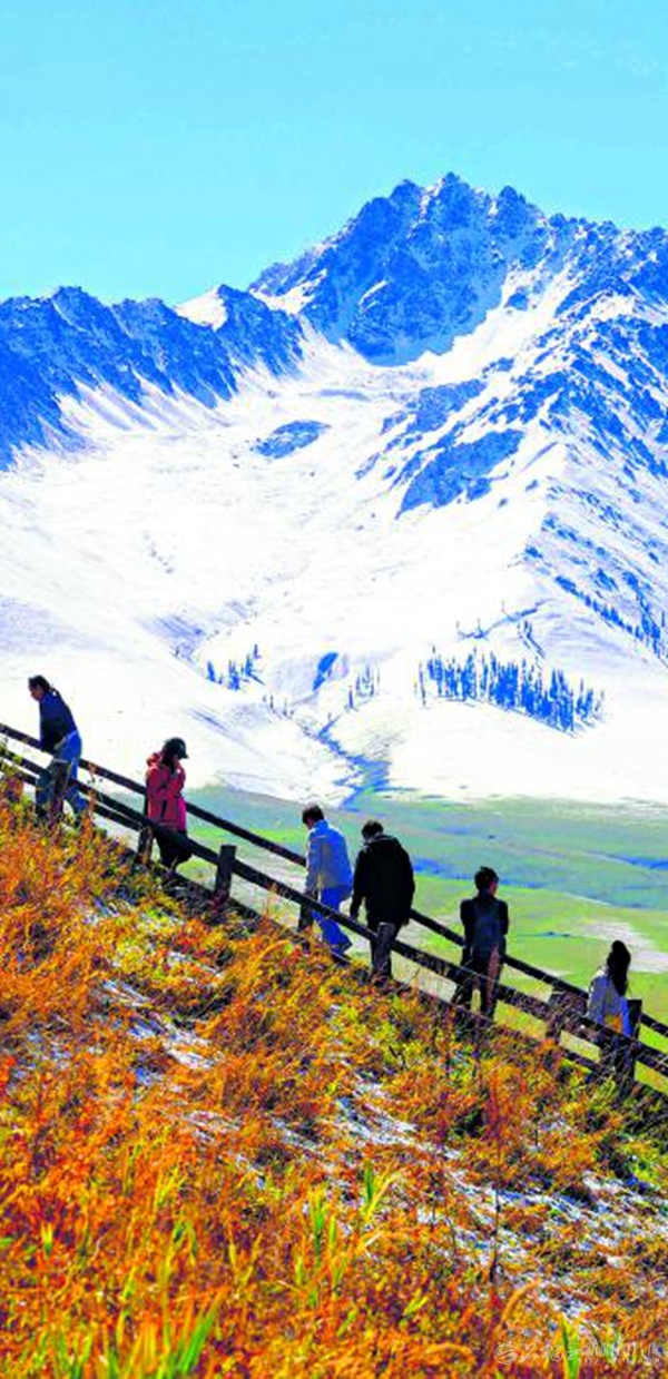 10月1日,游客在新源县那拉提景区天界台登高。秋日的那拉提草原上,草尖被镀上金边,与远处的雪山交织,勾勒出“半雪半草”的别致画面,吸引游客纷至沓来。张文庭摄