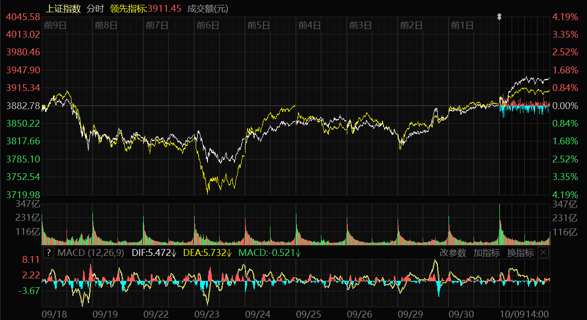 天山网-新疆日报讯(记者冉虎报道)10月9日,A股迎来10月“开门”红走势,上证指数突破3900点,再创十年新高。截至收盘,上证指数涨1.32%,报收3933.97点;深证成指涨1.47%,报收13725.56点;创业板指涨0.73%,报收3261.82点。沪深两市成交额达26532亿元,较9月30日大幅放量4718亿元。