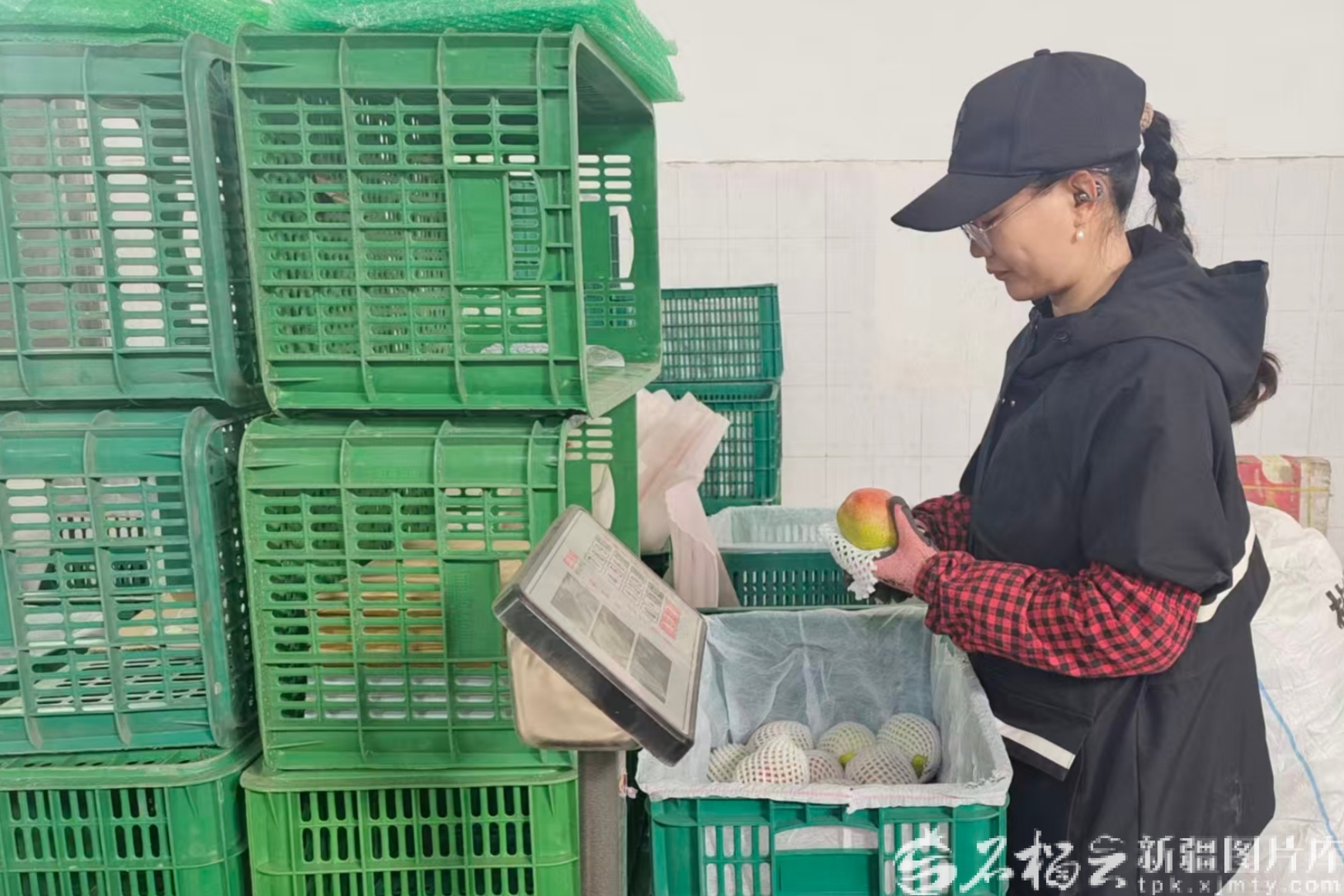 10月10日,在库尔勒金丰利冷藏有限公司的香梨加工车间,工人熟练地分拣、包装香梨。这些散发着清香的果实即将开启跨国之旅,远销加拿大、澳大利亚、印度尼西亚等国家。
