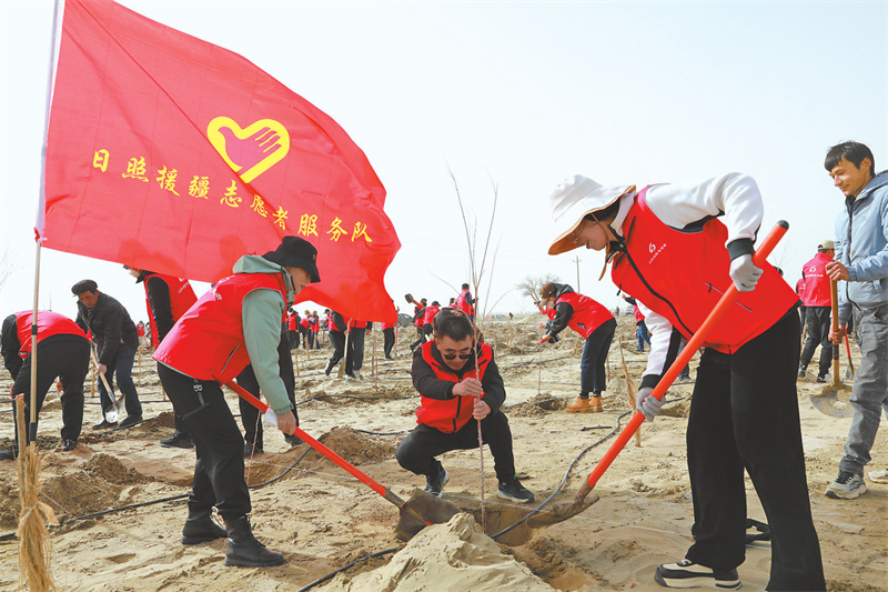 山东日照援疆志愿者服务队在麦盖提县进行植树。(图片为受访者供图)