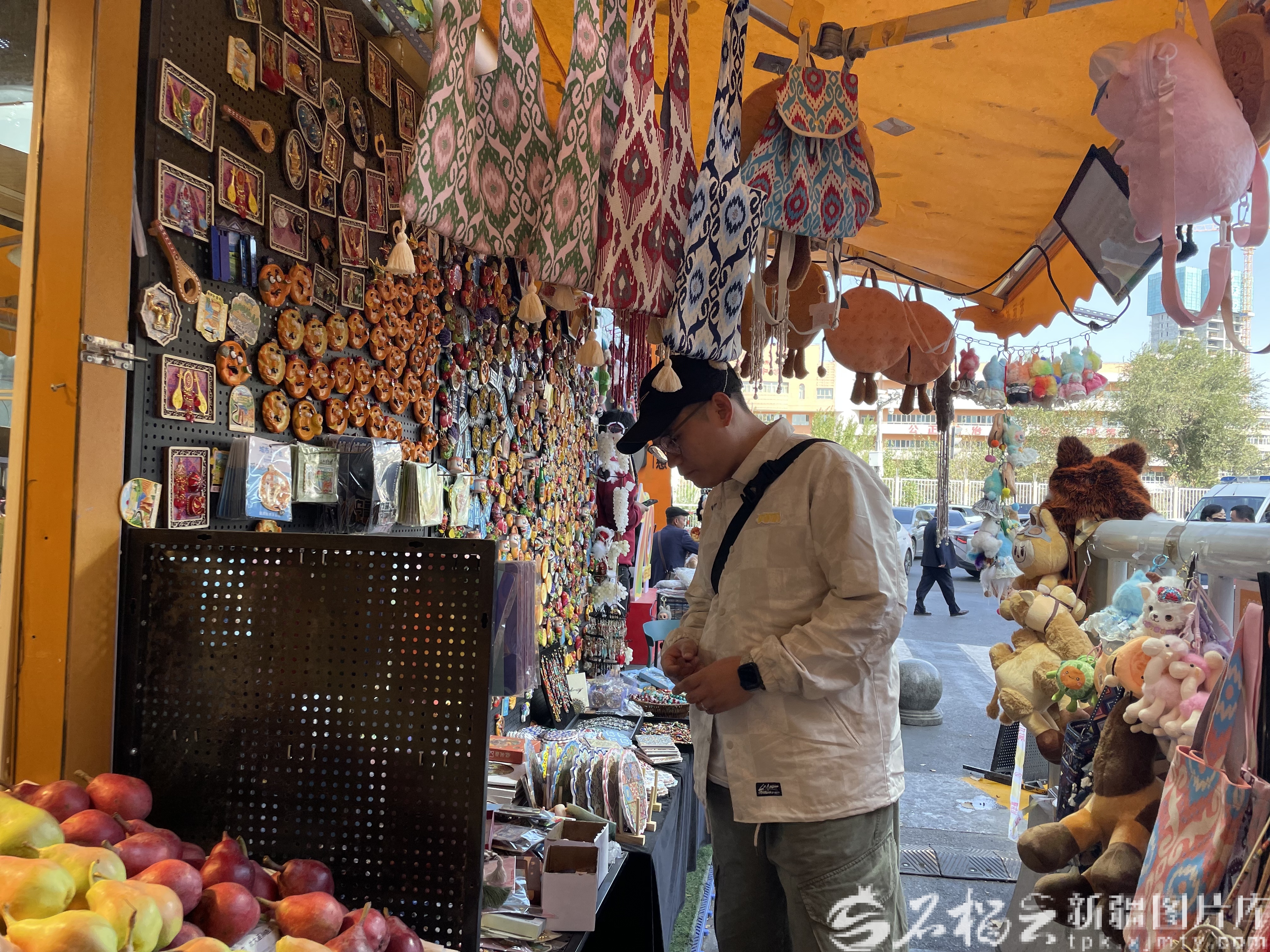 9月26日,乌鲁木齐市沙依巴克区和田二街,游客在选购文创产品。石榴云/新疆日报记者 索蓉芝摄