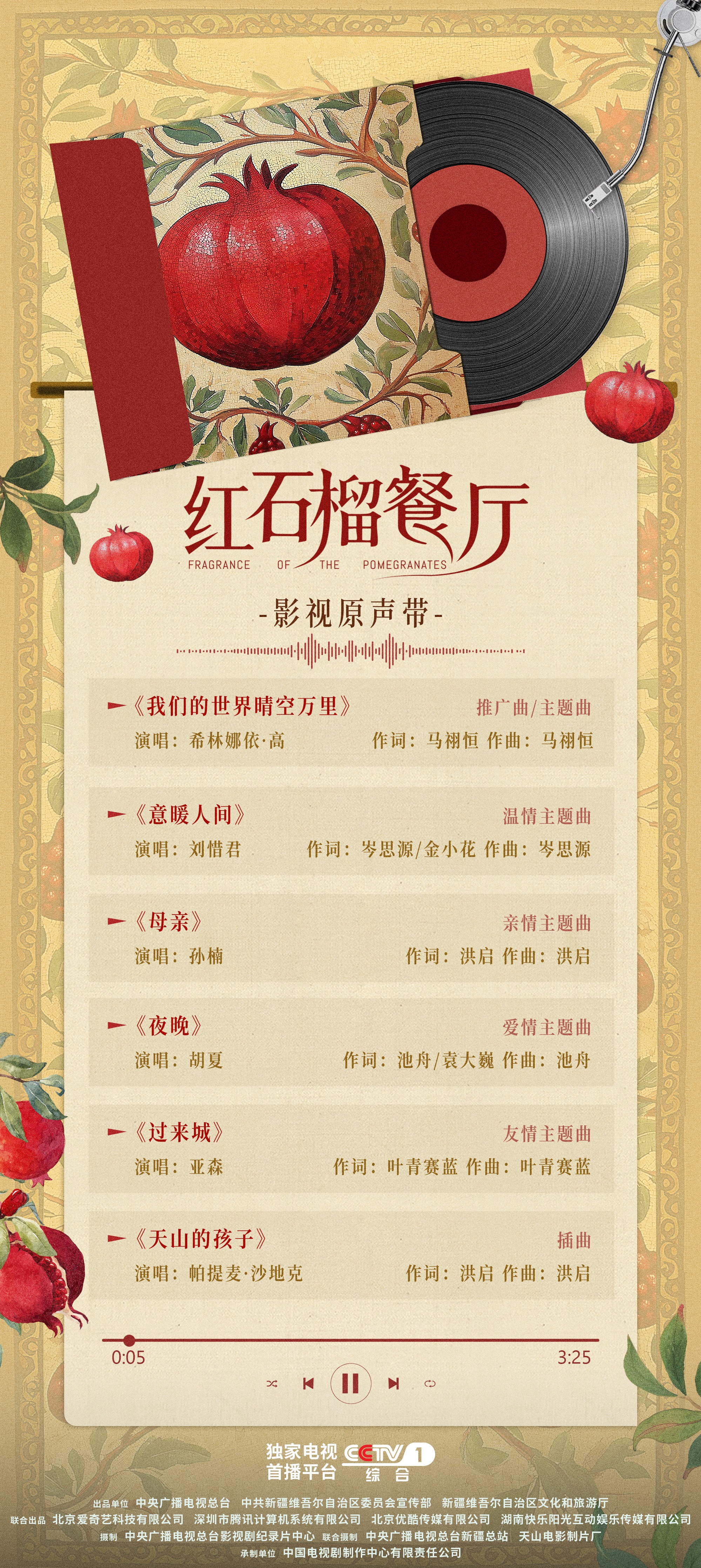烟火人间,温暖如歌。中央广播电视总台、新疆维吾尔自治区党委宣传部、新疆维吾尔自治区文旅厅共同出品的首部新疆都市情感剧《红石榴餐厅》今晚登陆CCTV-1黄金档。在公布的电视剧原声带歌单中,可以看到孙楠、希林娜依·高、刘惜君等众多实力“大咖”云集,这部剧带来的不仅是温暖美好的都市情感,还有一场音乐的盛宴。